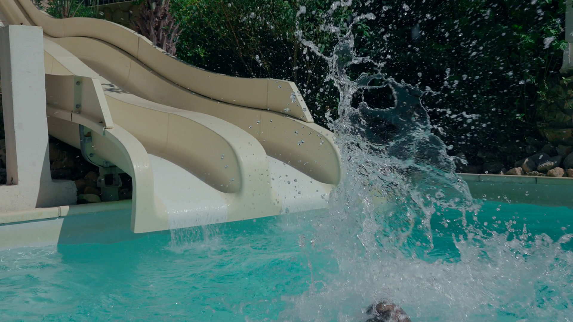 An 8yearold Girl Wearing Sunglasses Slides Down A Water Slide Into A Pool In Slow Motion Surrounded By GreeneryÂ