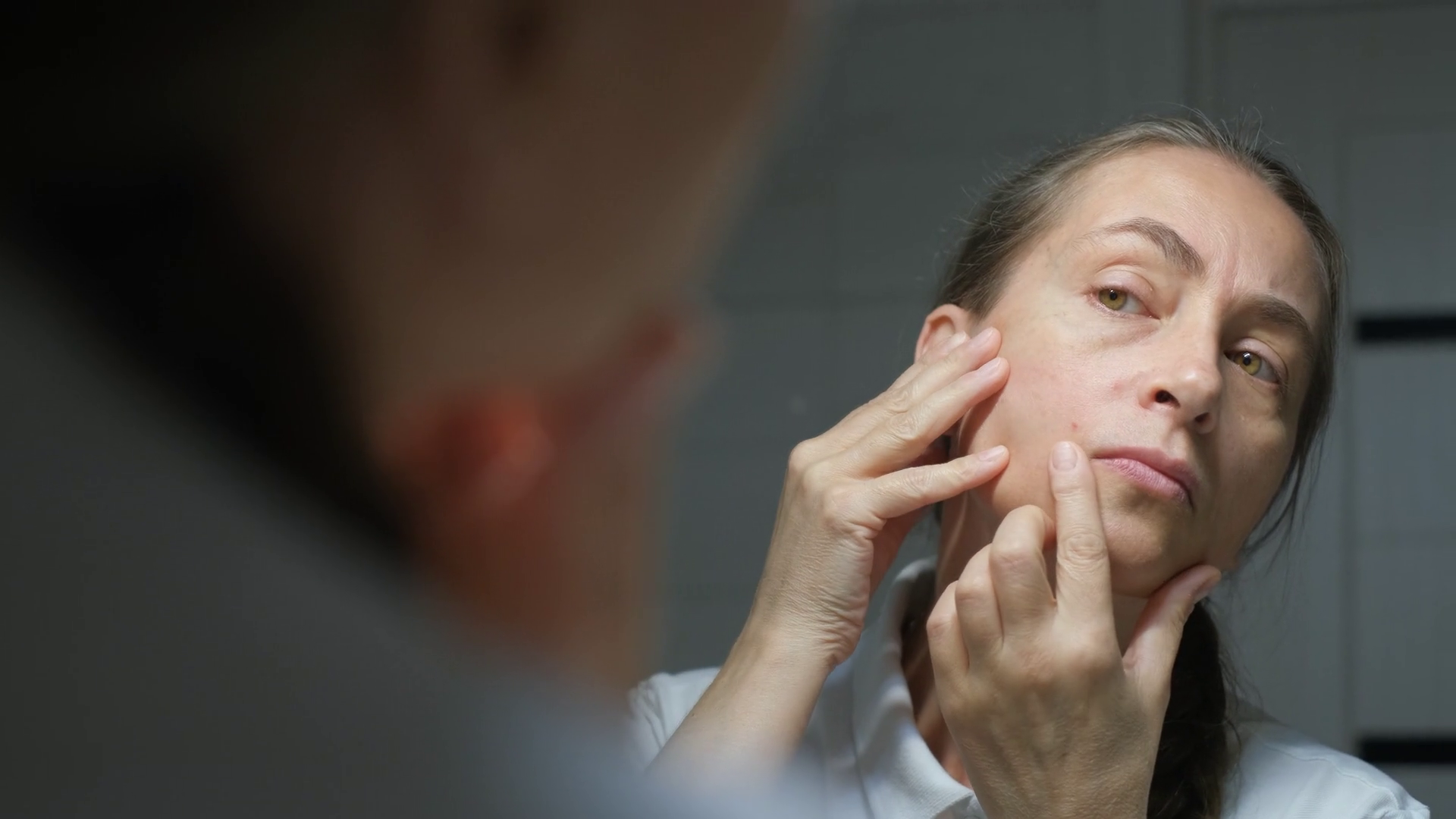 An Aged Woman Examining The Skin Of Her Face In The Mirror CloseupÂ