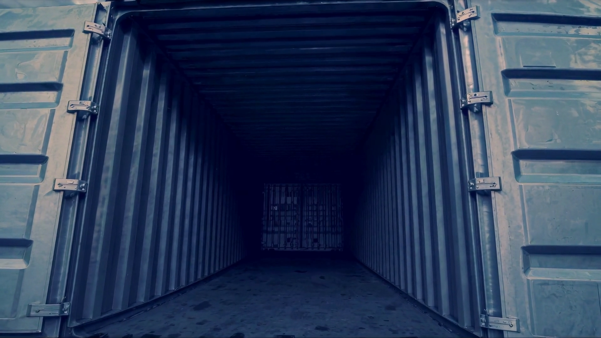 An Empty Shipping Container Slowly Opens Up Revealing Its Unexpectedly Interior Against A Moody Sky