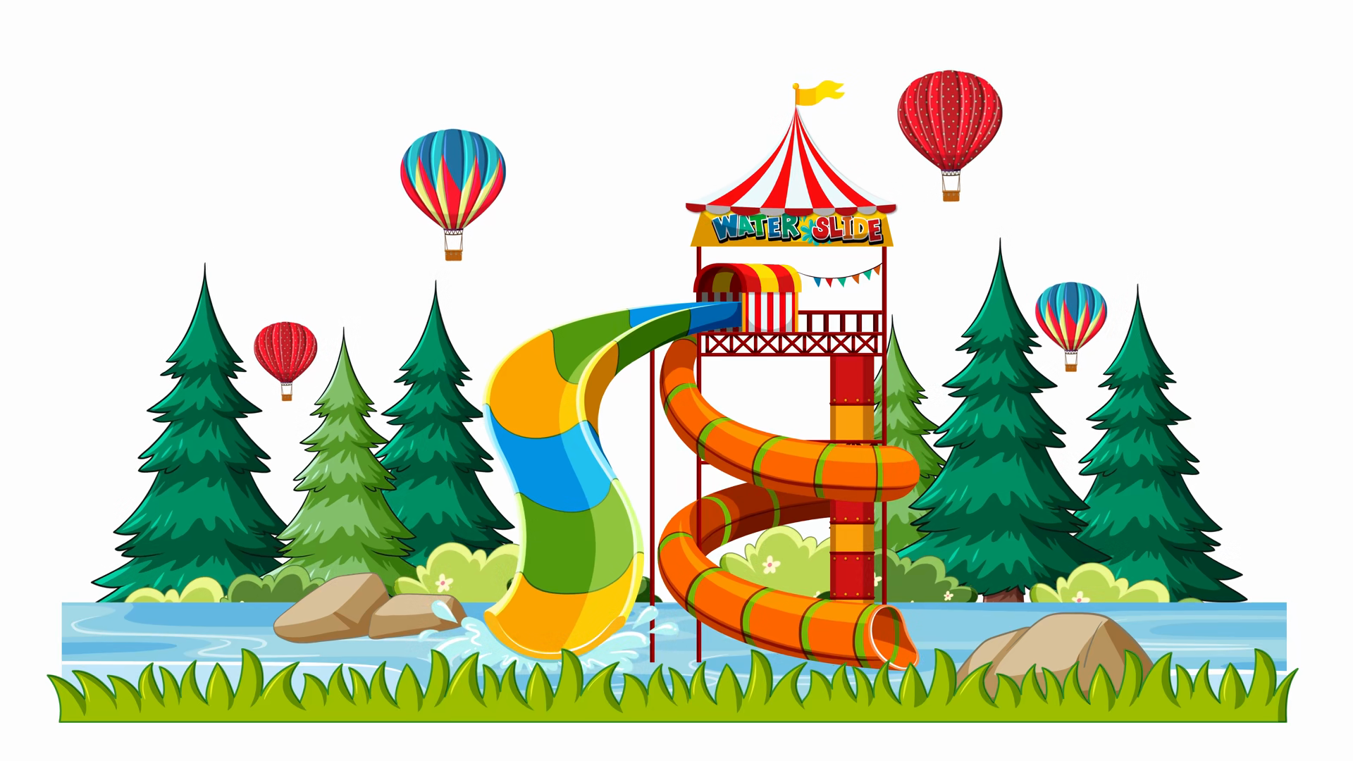 Animated Outdoor Water Park Scene With Colorful Slides And Hot Air BalloonsÂ