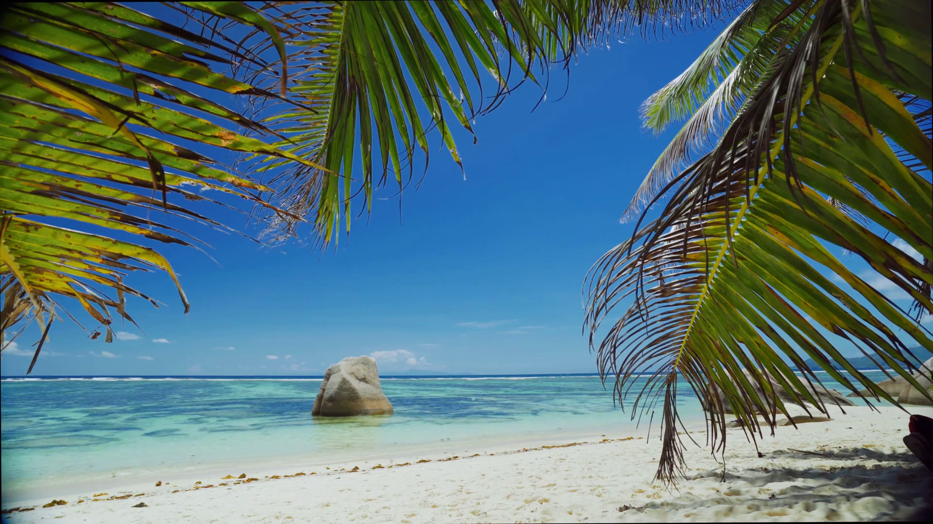 Anse Source Dargent In Seychelles Palm Tree Leaves Motion On Ocean Breeze Sandy Beach And Ocean In BackgroundÂ