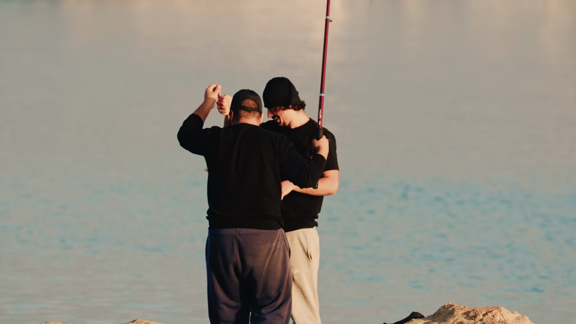 Antibes France December 22 2025 Two Men Standing On A Rocky Shore As One Lifts A Freshly Caught Fish From A Fishing LineÂ