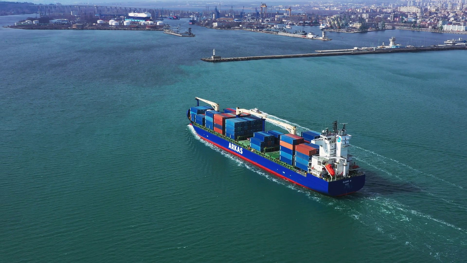 Arkas Container Cargo Port Of Varna Bulgaria February 2019 Aerial View Large Vessel Transports Containers With Goods By Sea Arrival Of Merchant Ship In A City Seaport With CraneÂ