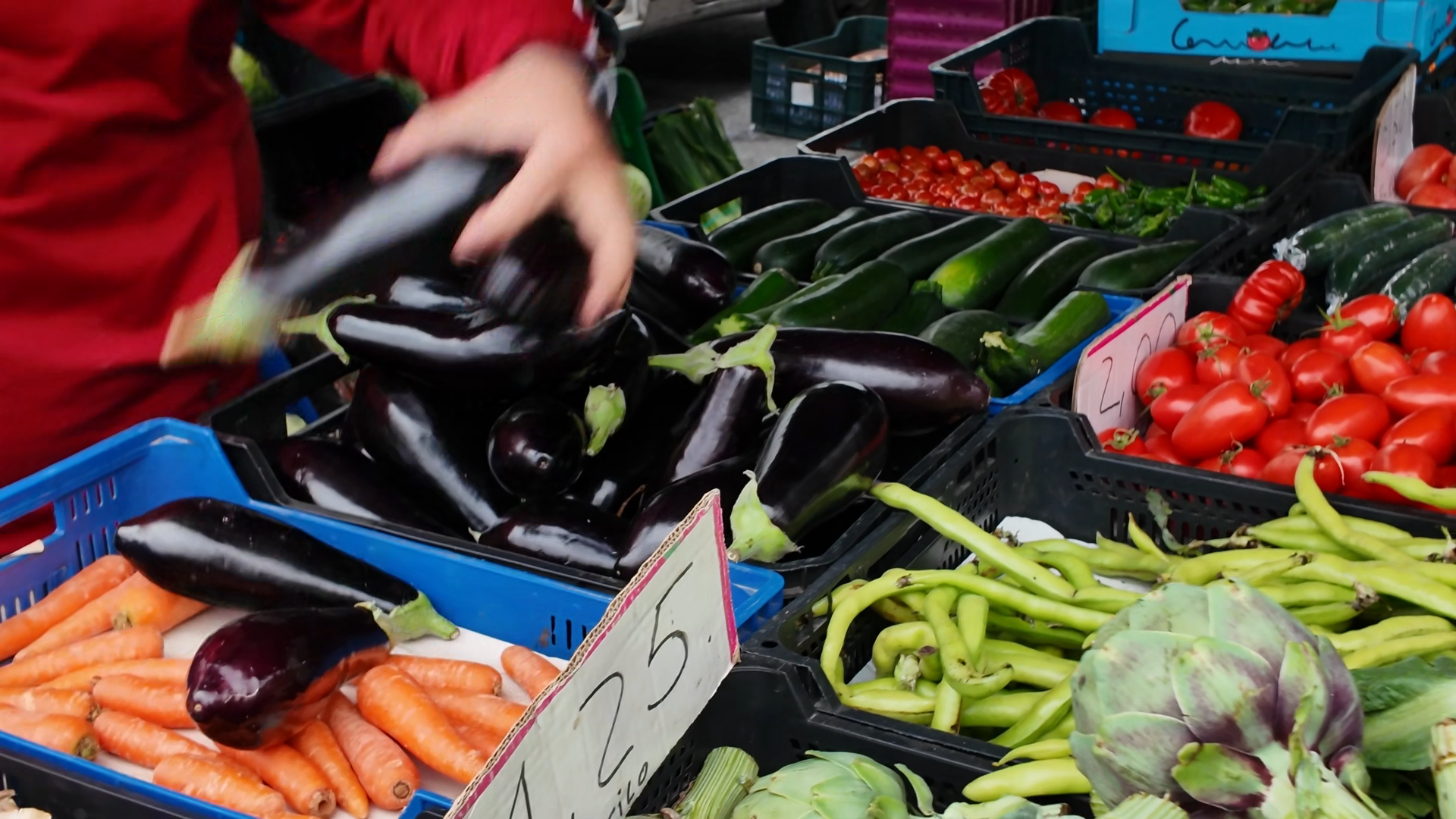 Arranging Fresh Organic Eggplants At A Vibrant Farmers MarketÂ