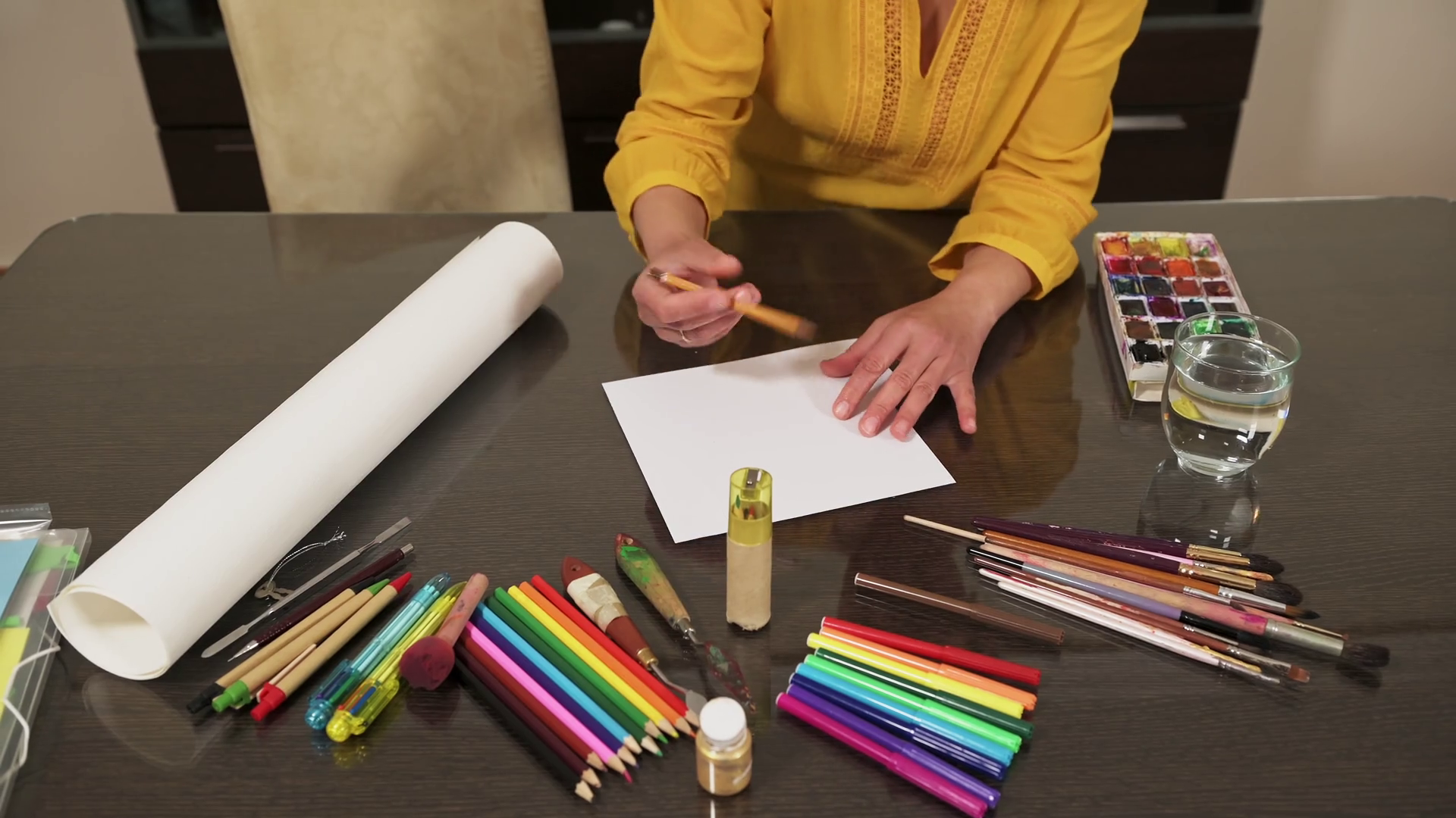 Artist Creating Artwork At Table With Colorful Art SuppliesÂ