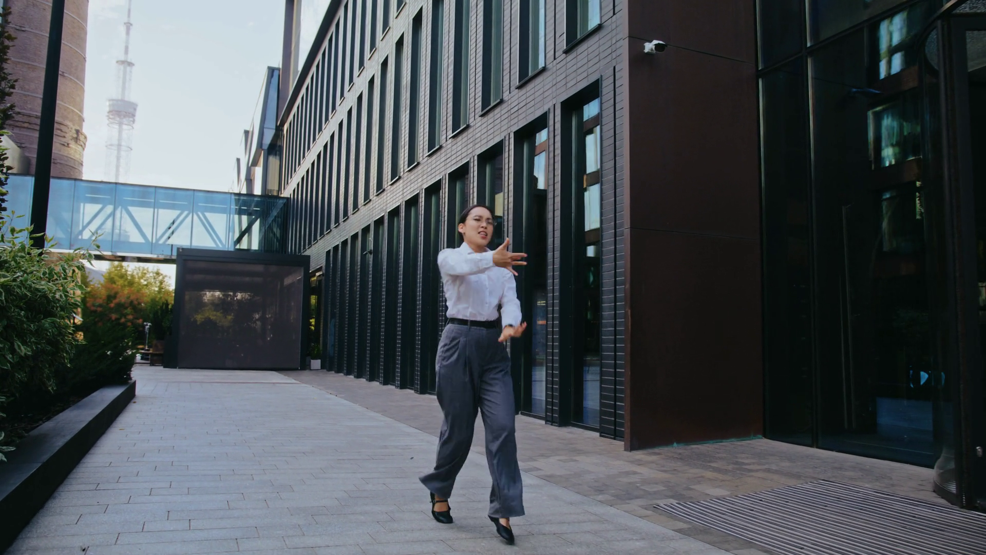 Asian Businesswoman Performs Dance Moves Walking Past OfficeÂ