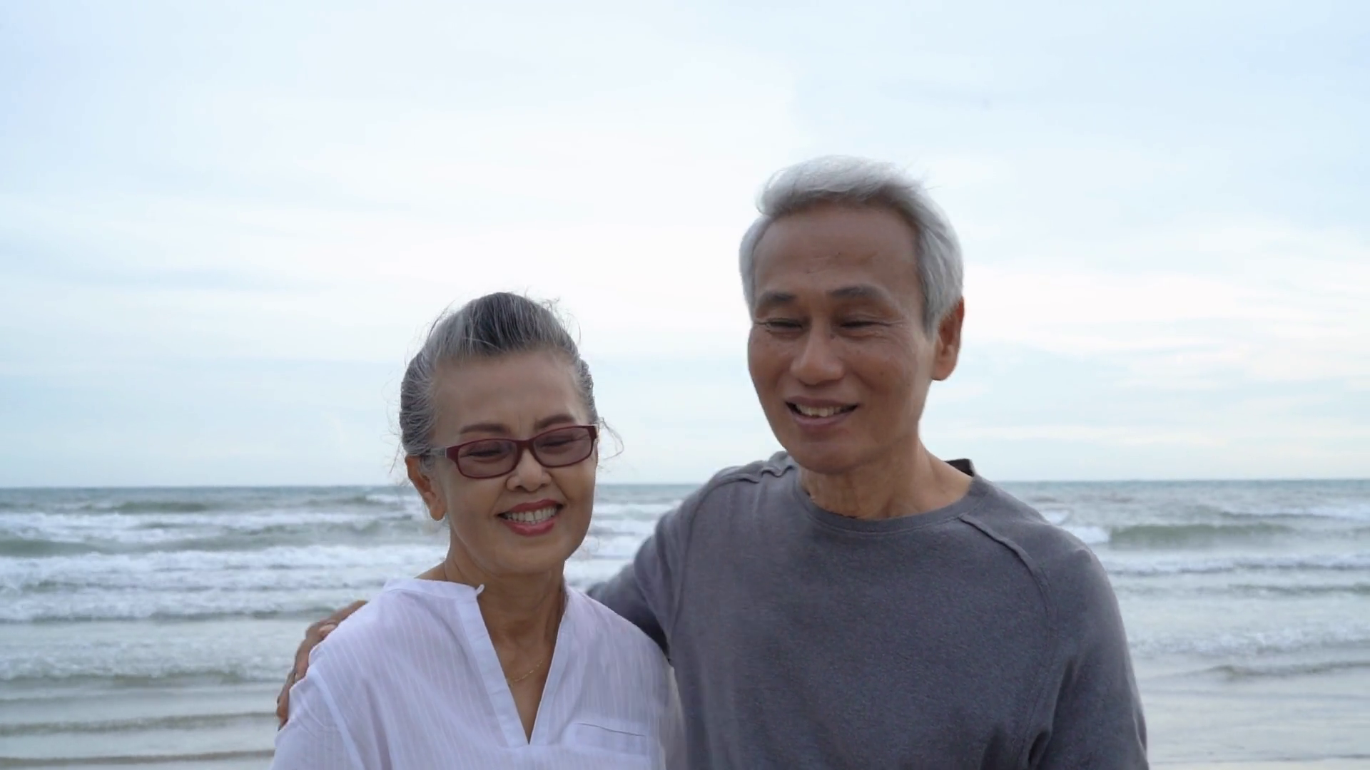 Asian Couple Senior Elder Retire Resting Relax Kissing And Hugging Sunset Beach Honeymoon Family Together Happiness People Lifestyle Slow Motion FootageÂ