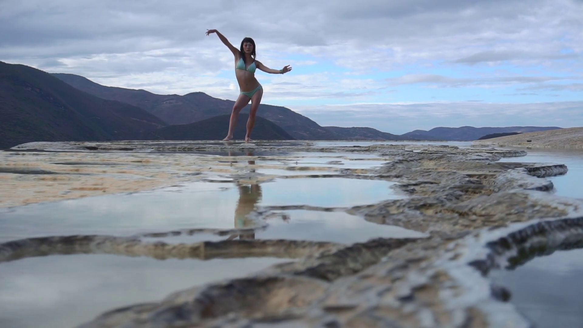 Asian Girl In Bikini Is Dancing On The Edge Of Natural Petrified Waterfall Hierve El Agua In Mexico Oaxaca TravellingÂ