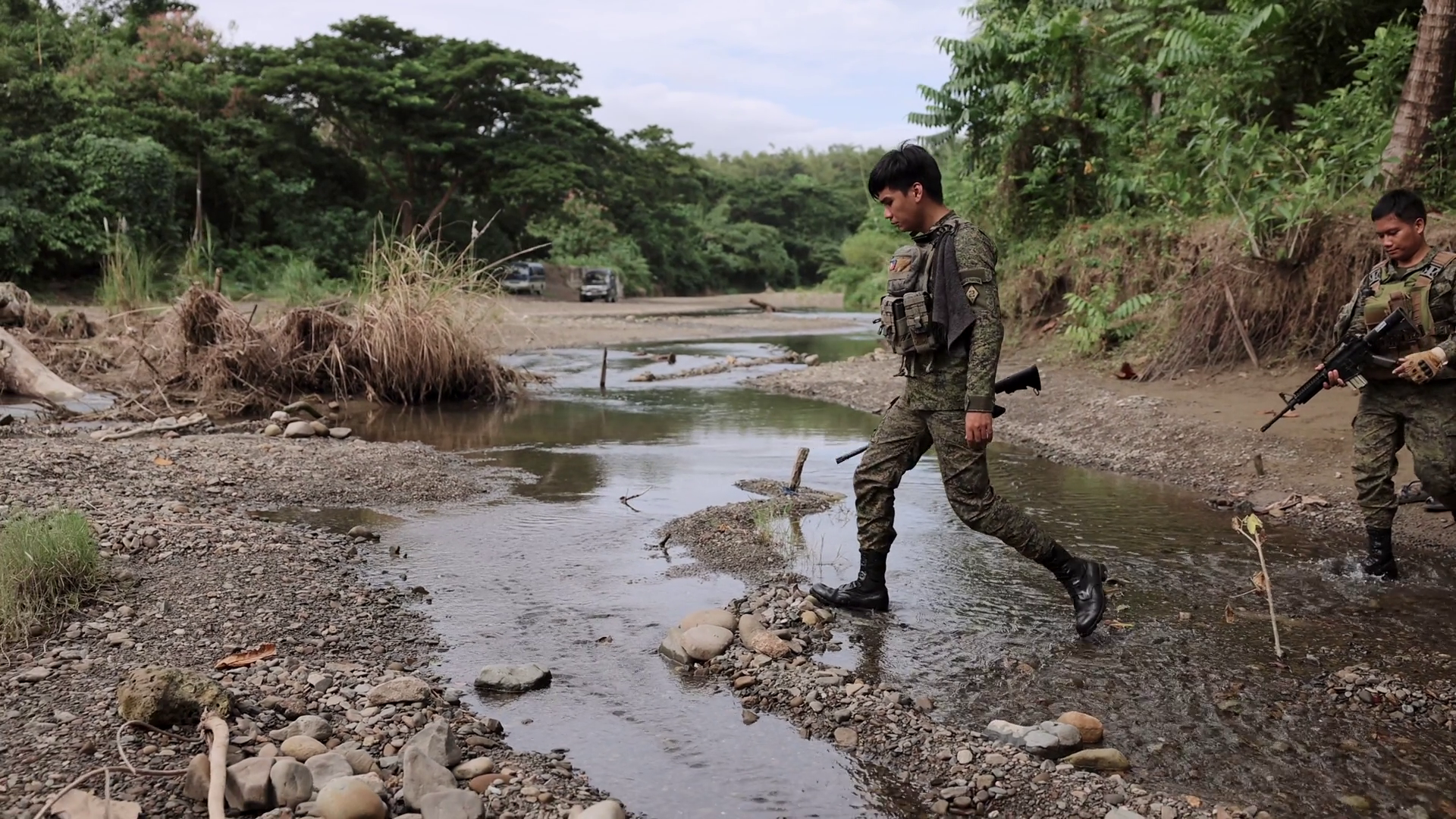 Asian Troops Crossing Jungle Stream War Warfare Guns Gun Riffel Ak 47Â