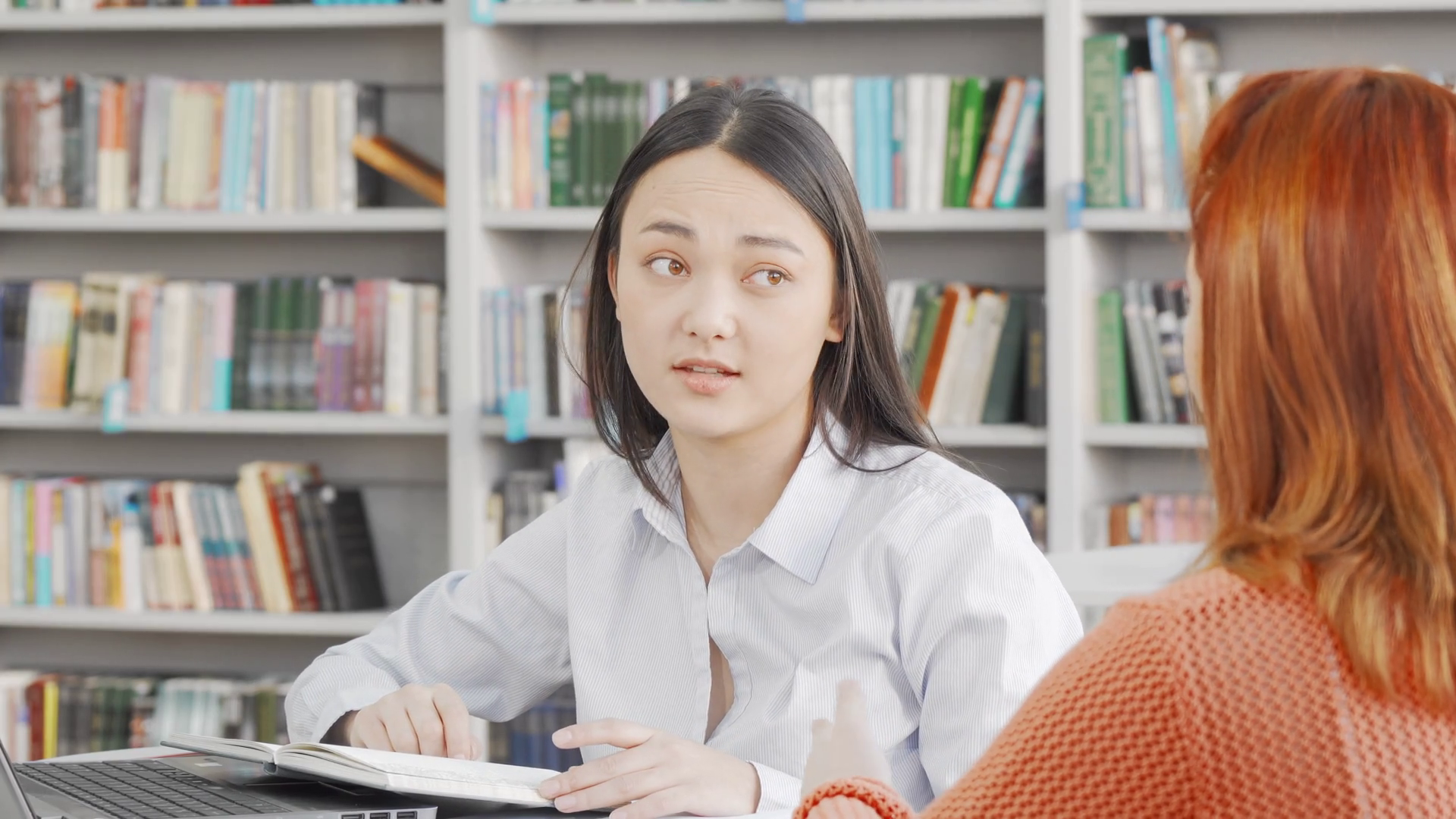 Young Woman Conversing With A Friend At College LibraryÂ