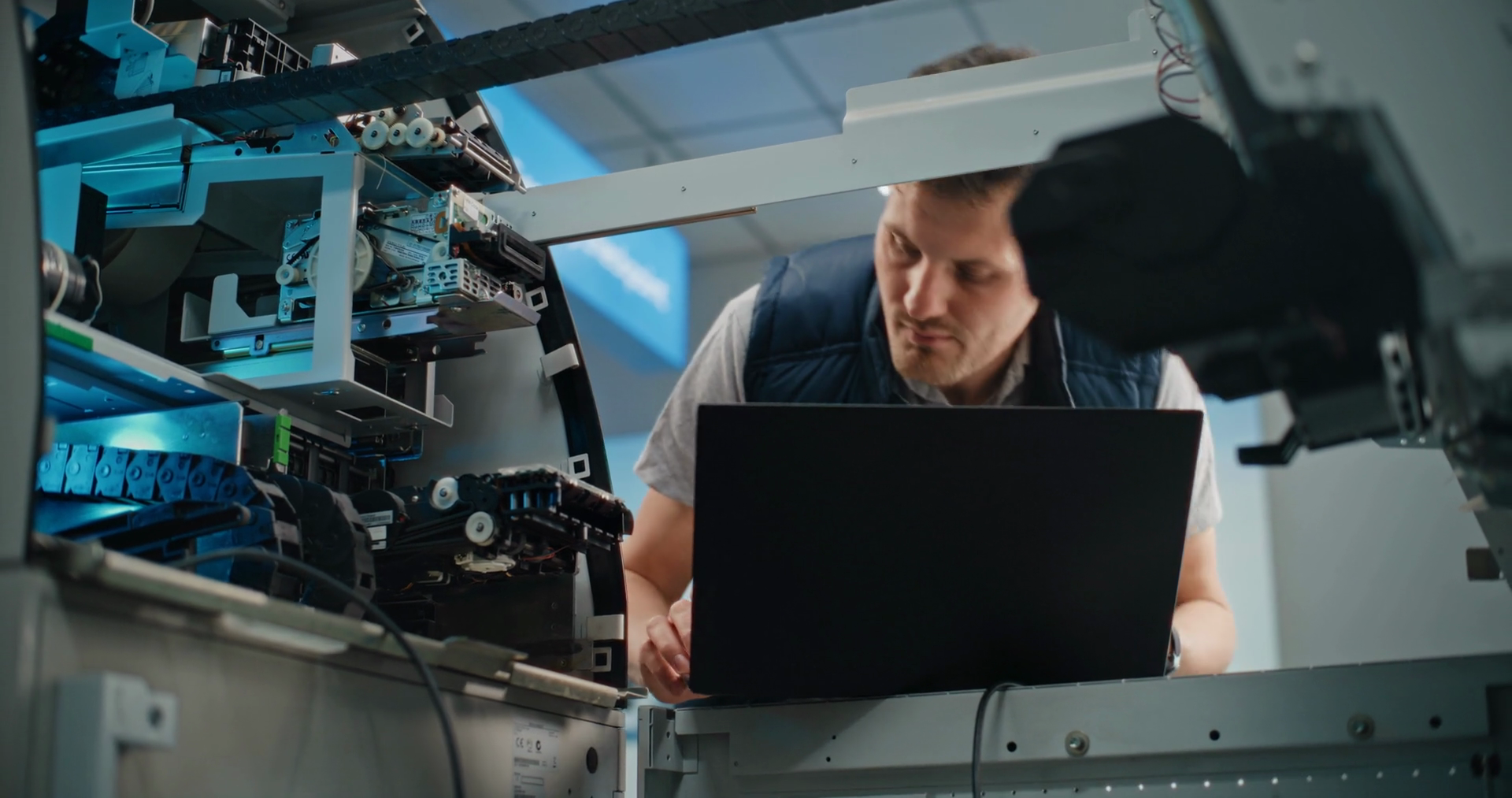 Atm Technician In Uniform Servicing Cash Dispenser Machine In Modern Airport Terminal Male Worker Conducting Diagnostics Of Atm MachineÂ