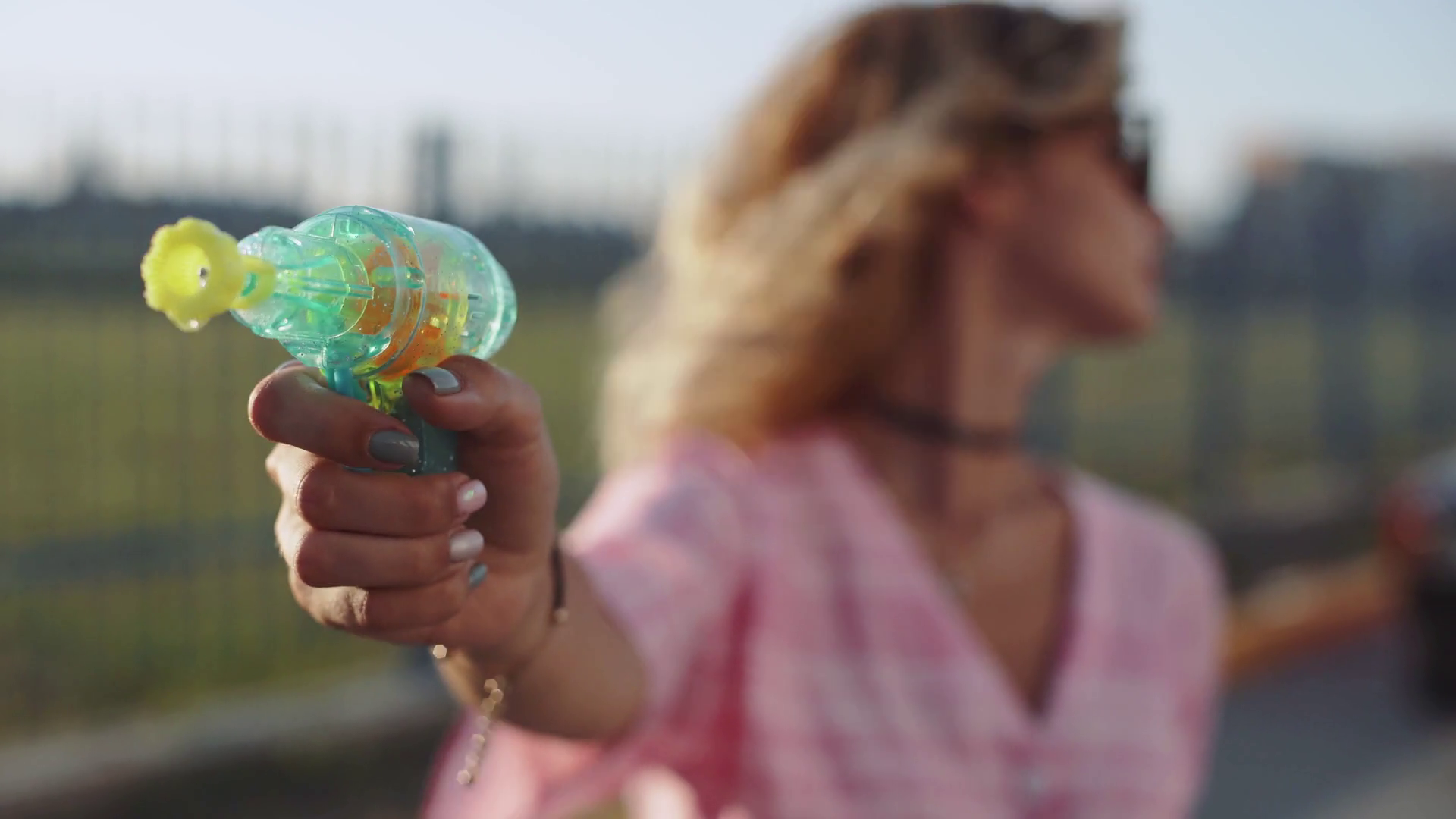 Young Woman Creates Soap Bubbles With A Toy Gun At Sunset On The StreetÂ
