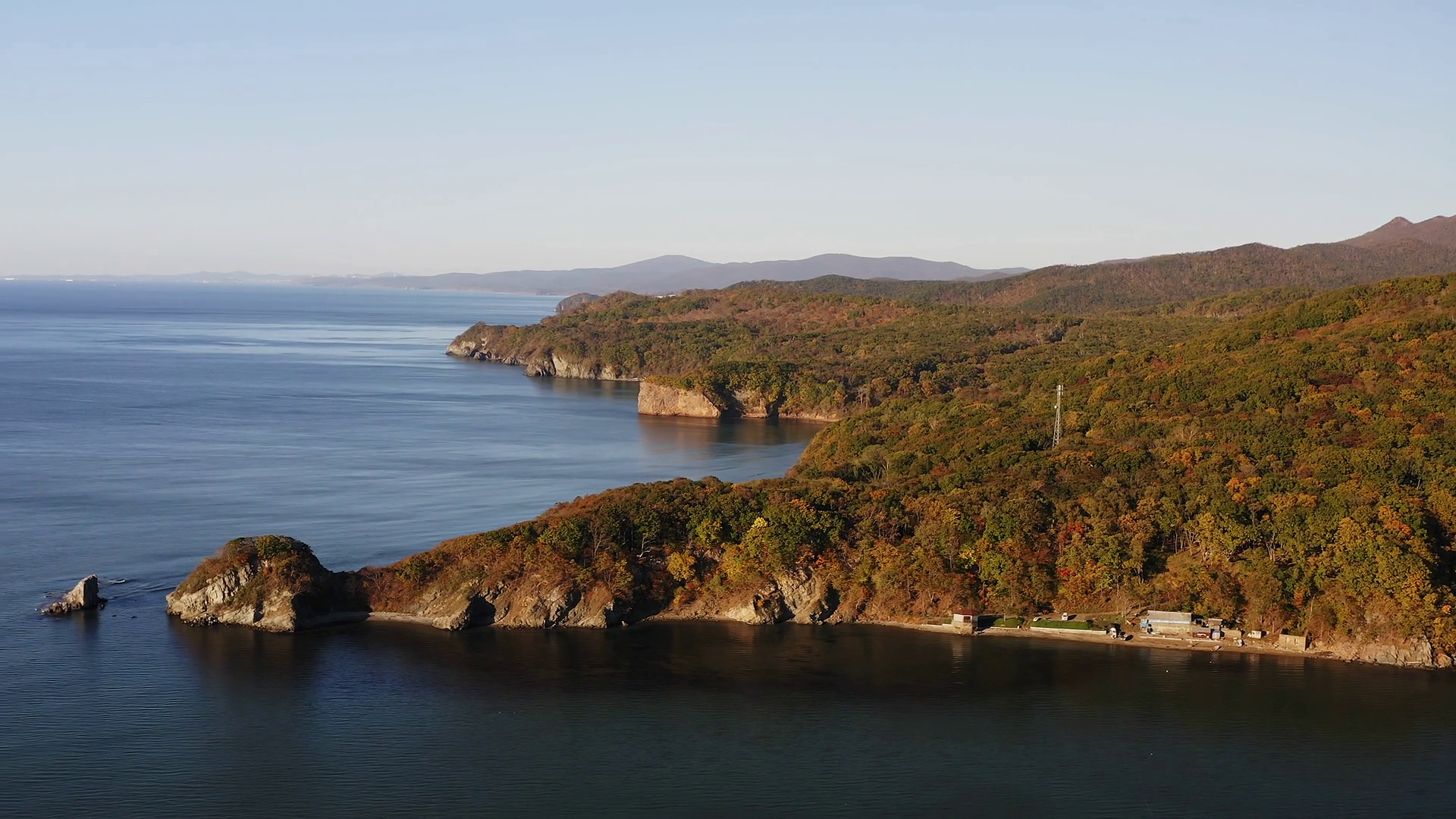Autumn Forest Landscape Rocky Promontory On The Seashore With Green Yellow Red Tree Crowns In Deciduous Forest In Autumn In October Indian Summer Drone ViewÂ