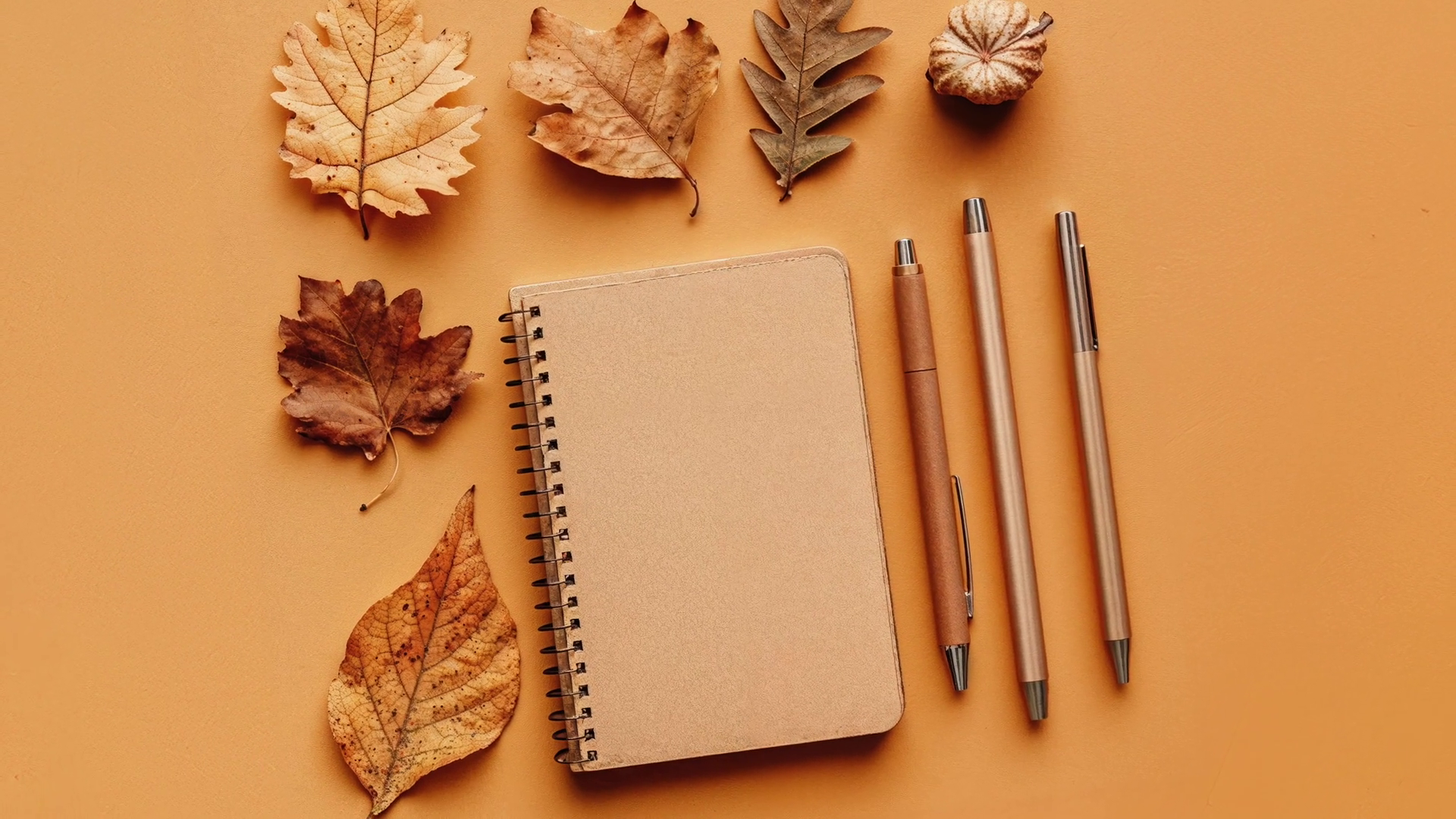 Autumn Leaves With Notebook And Pens On Orange BackgroundÂ