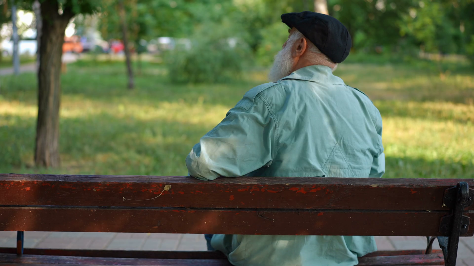 Back View Medium Shot Of Senior Bearded Man In Hat And Cloak Sitting On Bench Turning Looking Around Relaxed Caucasian Retiree Resting In Sunny Summer Spring Park Outdoors ThinkingÂ
