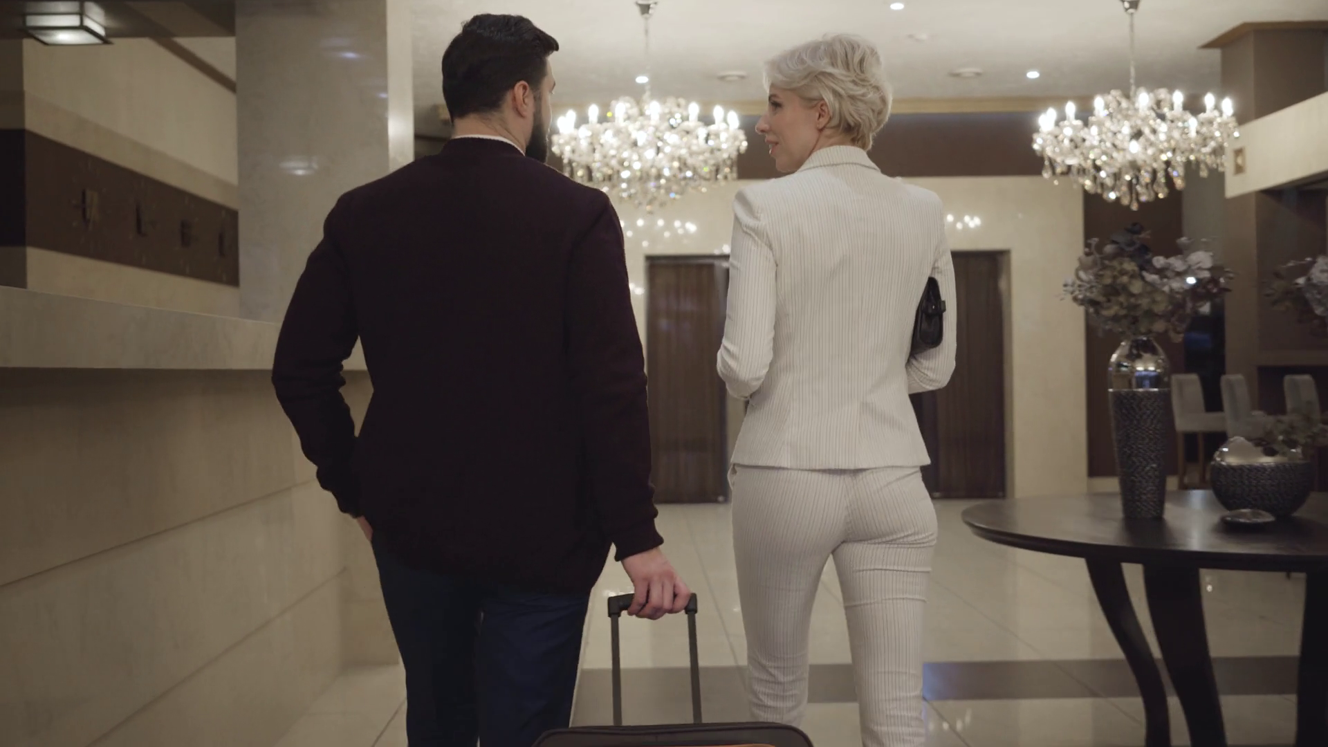 Back View Of Male And Female Traveller Walking In Luxurious Vestibule Camera Following Man And Woman With Suitcase Arriving At Highclass Hotel Tourism Wealth Luxury LifestyleÂ