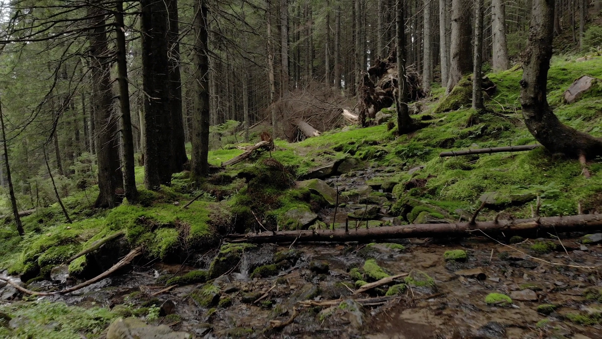 Serene Forest Landscape Pine Trees Stones Moss And StreamÂ
