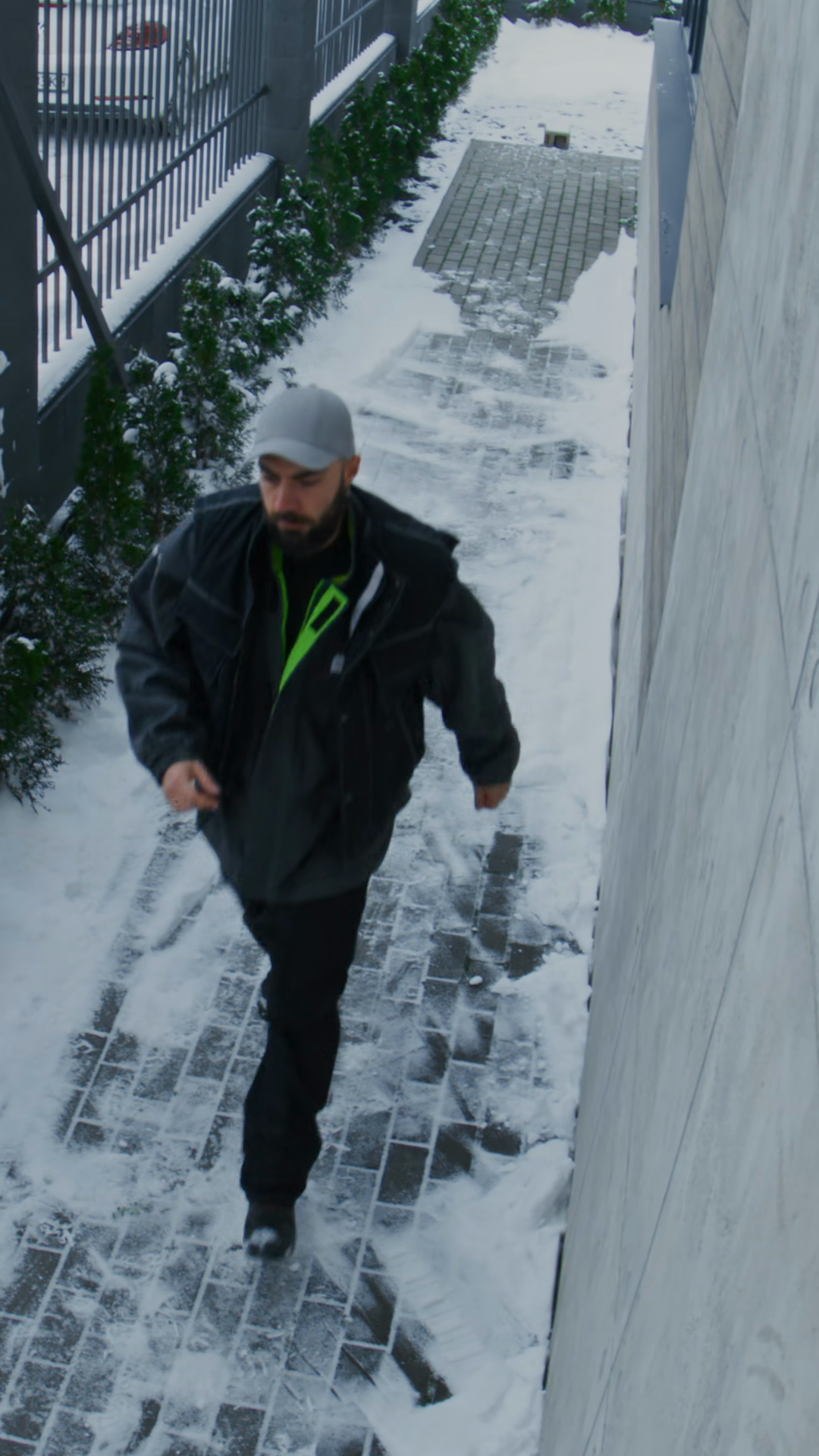 Bearded Man Wearing Casual Clothing Walks Along Cleared Pathway Captured Outdoor Surveillance Camera Everyday Pedestrian Movement WinterÂ