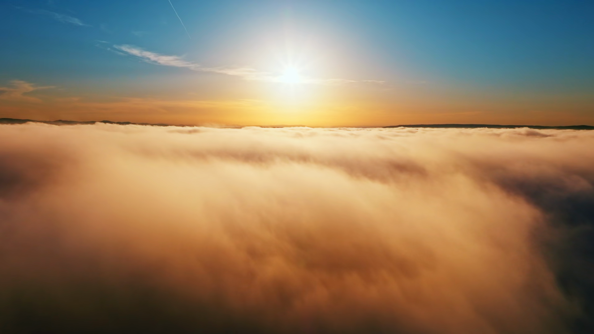 Beautiful Aerial Panorama Above Clouds Bright Sun Flare Clear Sky High Altitude Drone Flight Sunset Heaven View Peaceful Nature Beauty Meditation Spiritual Journey Inspiration Concept FootageÂ
