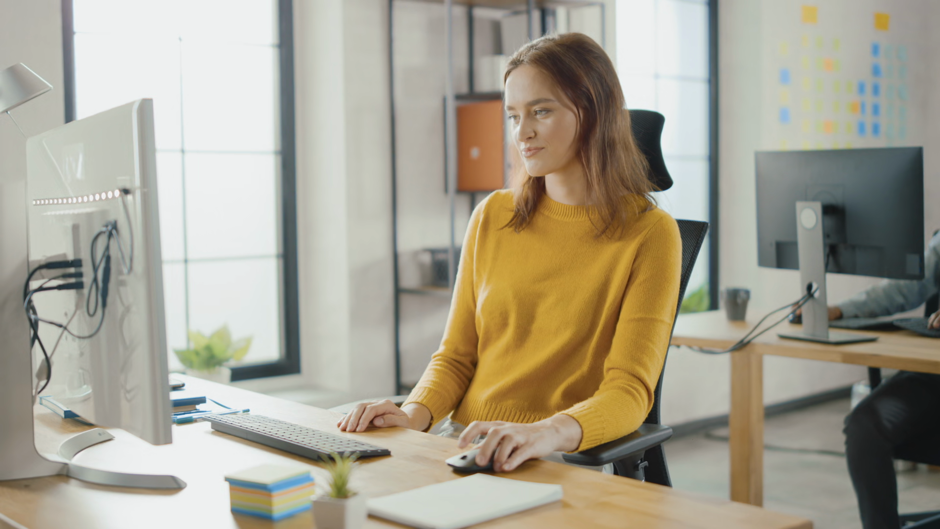 Beautiful And Smart Red Haired Female Specialist Sitting At Her Desk Works On A Desktop Computer In The Background Modern Bright Office With Diverse Group Of Professionals Working For Growing StartupÂ
