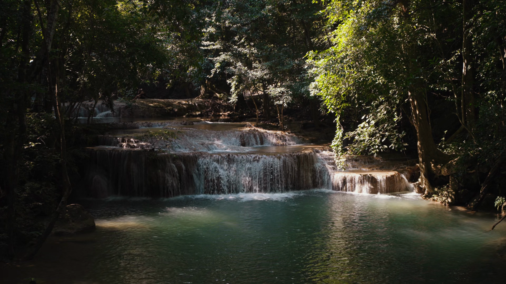 Beautiful Tiered Waterfall Flowing Through A Lush Tropical Forest In Kanchanaburi Thailand Clear Turquoise Water Cascades Over Limestone Rocks Creating A Peaceful Natural LandscapeÂ