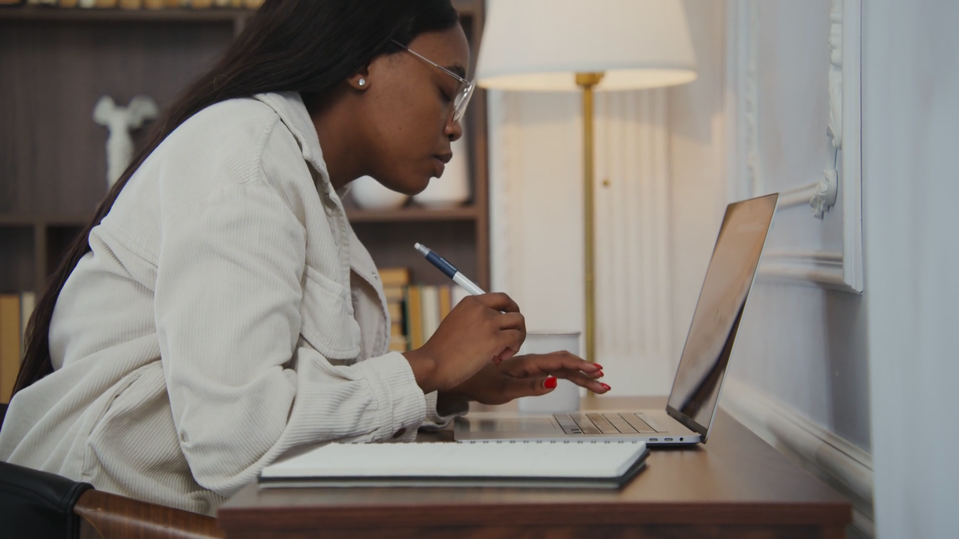 Talented Young Woman In Glasses Works On A Laptop Taking Notes In A Notepad At A Stylish DeskÂ
