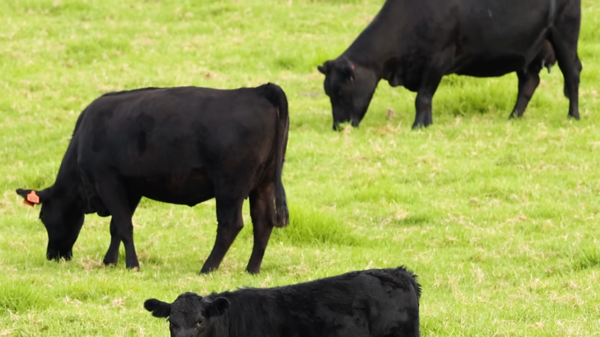 Black Angus Cows And Calves Grazing In Lush Green PastureÂ