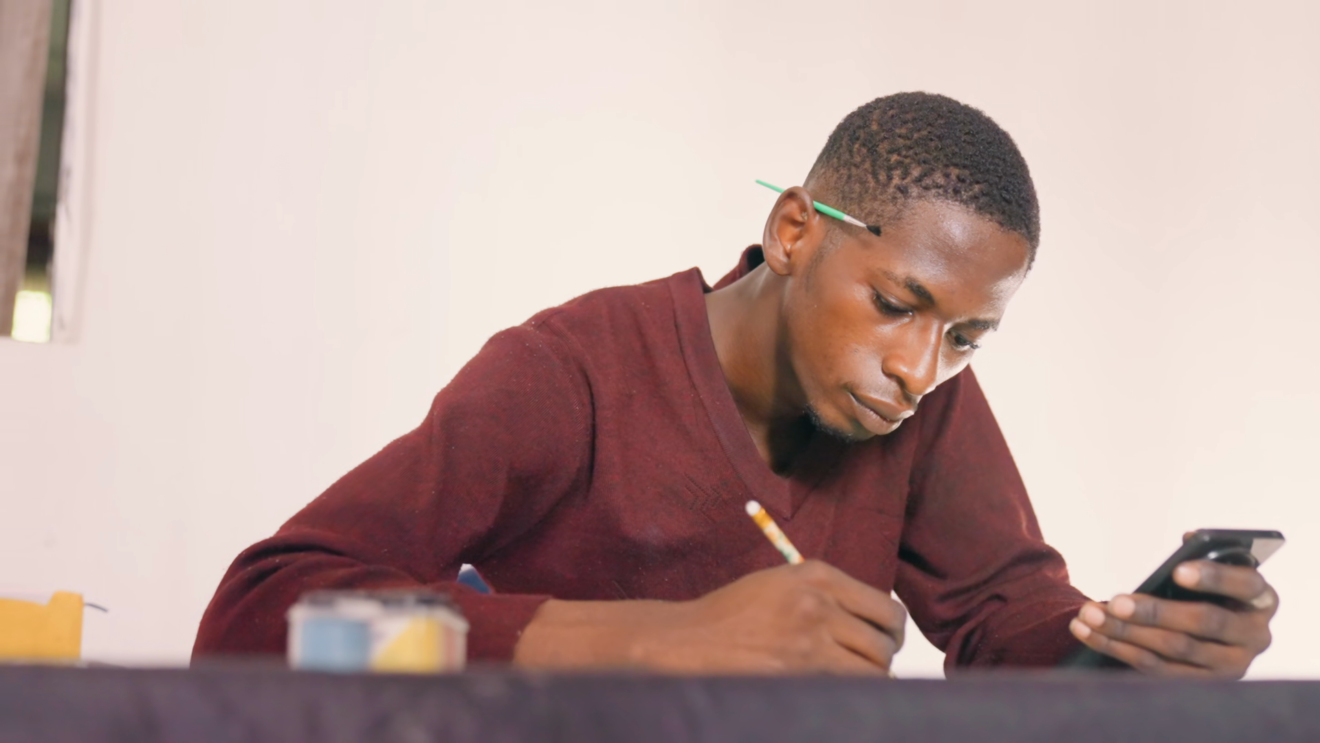 Black Male Artist Painting With Phone Reference Balancing Quick Sketch And Color Notes At Desk Intent Posture In Maroon Sweater IndoorÂ