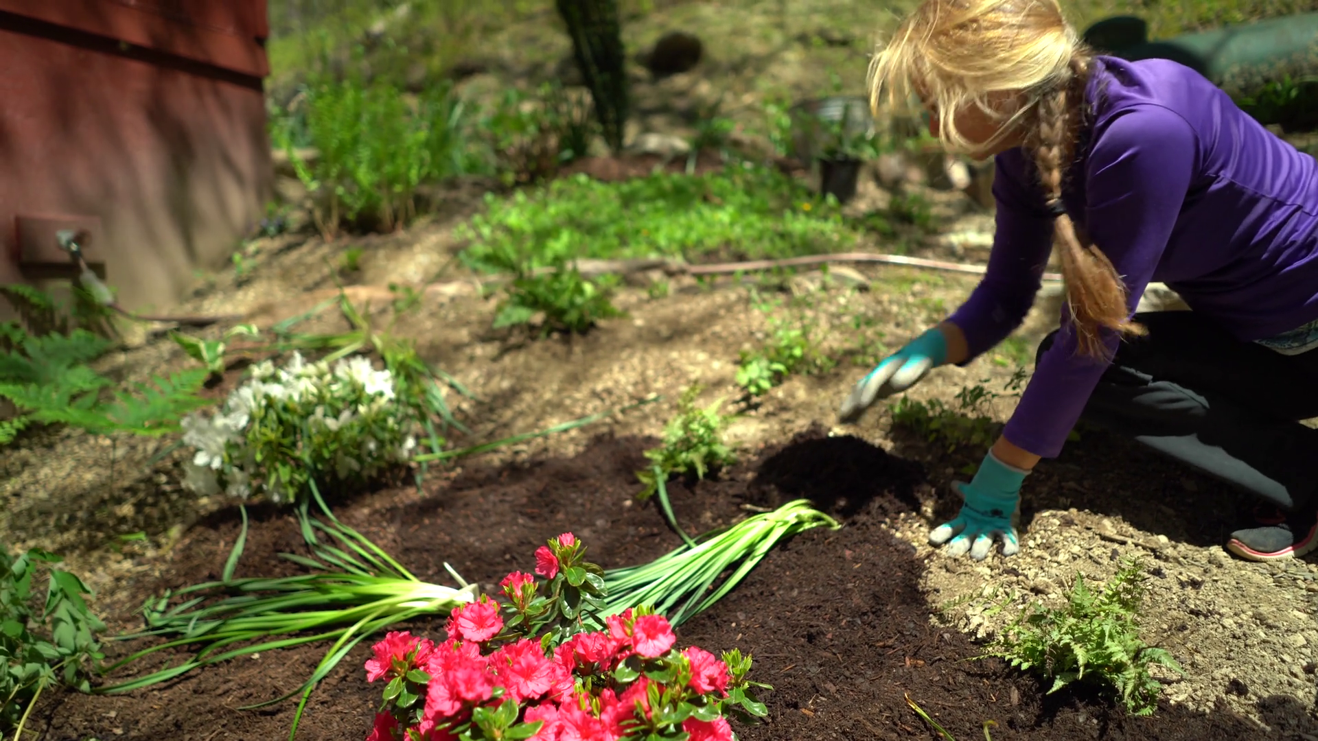Blonde Woman Puts Handfuls Of Mulch Onto Newly Planted GardenÂ