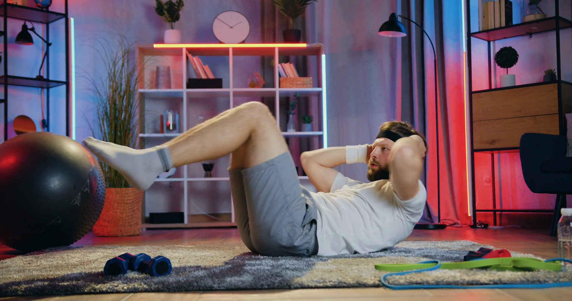 Bodycare Concept Where Attractive Active Sporty Bearded Guy In Sportswear Doing Criscross Crunch Exercises On The Floor At Home In TheÂ