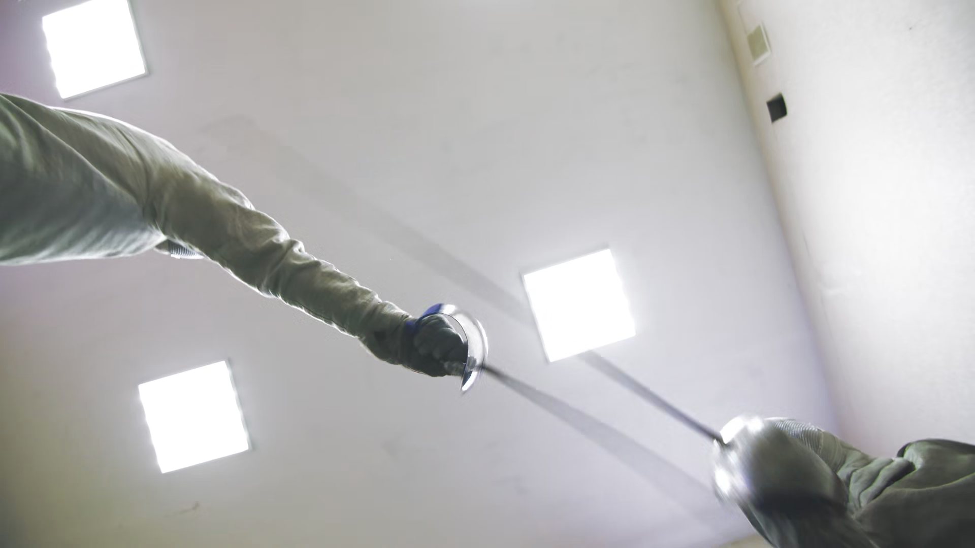 Bottomup Perspective Of Fencers Hands And Swords During A Wheelchair Fencing Duel At A Paralympic Training FacilityÂ