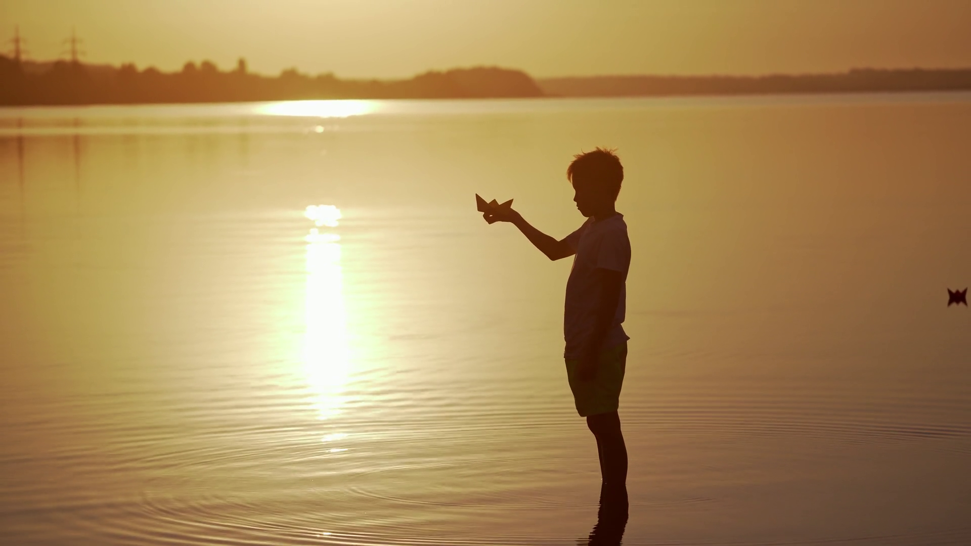 Boy With A Paper Ship Is Standing In The River Origami Boat Kid S Hands Beautiful Waves Ripple Background Travel And Nature Concept Video At SunsetÂ