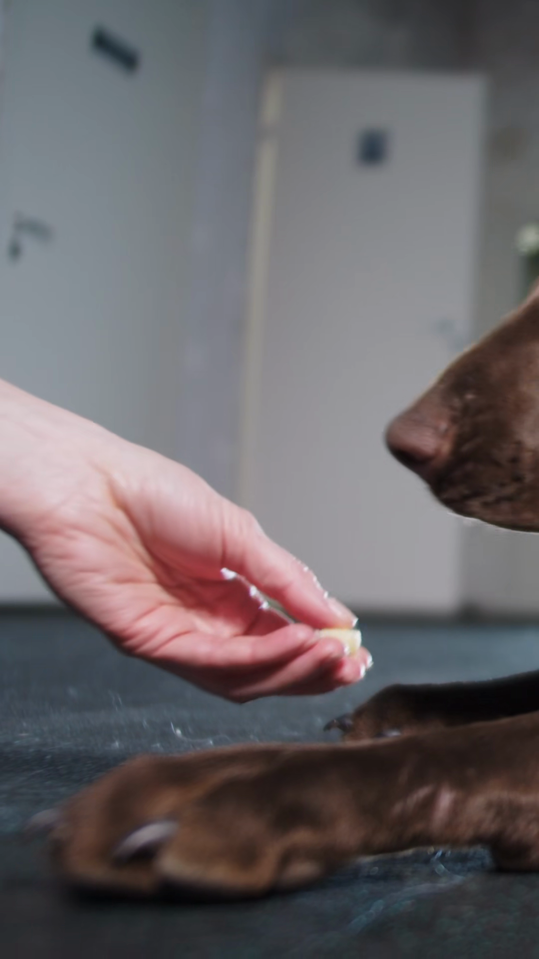 Brown German Shorthaired Dog With Red Collar Having A TreatÂ