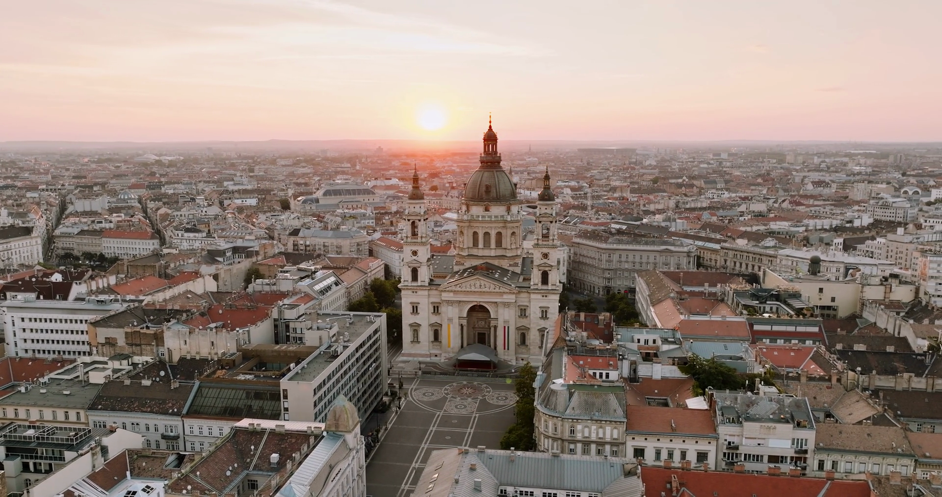 Budapest Hungary August 11 2024 Panoramic Cityscape Sunrise St Stephen Basilica Grand Architectural Masterpiece Dominates Skyline Blending Rich History Building City Charm Aeiral View TravelÂ