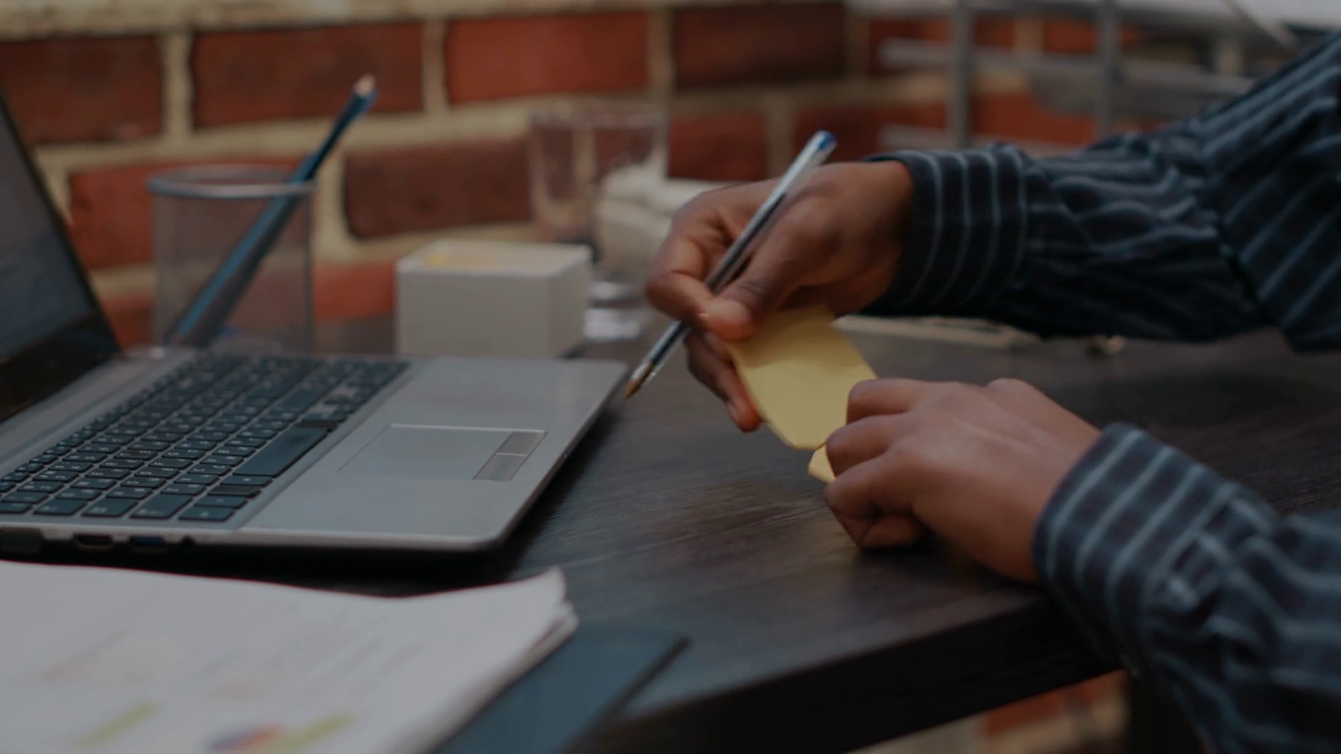 Business Man Putting Adhesive Post It Paper On Laptop Display To Remember Work Schedule Consultant Setting Sticky Notes On Computer As Meeting Reminder And To Do List In Office Close UpÂ