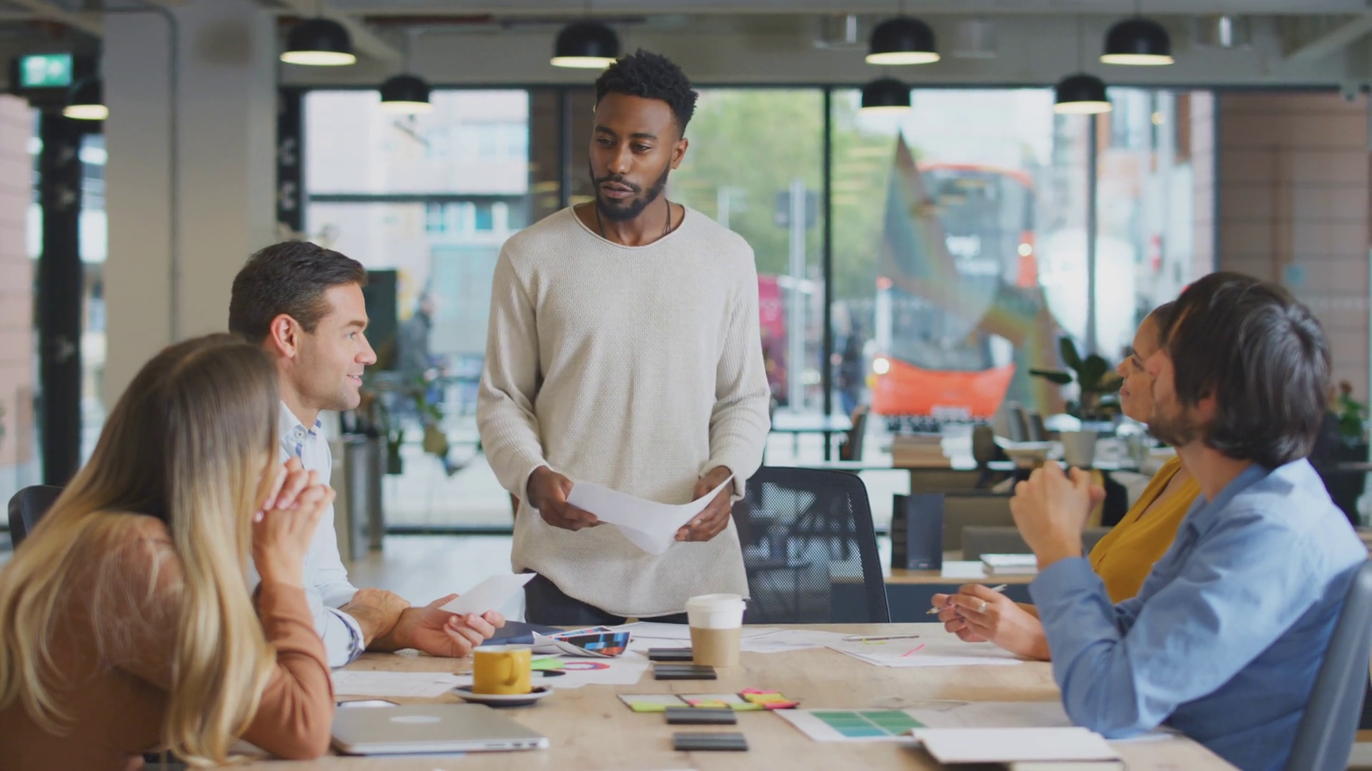 Businessman Giving Presentation To Colleagues Sitting Around Table In Modern Open Plan OfficeÂ
