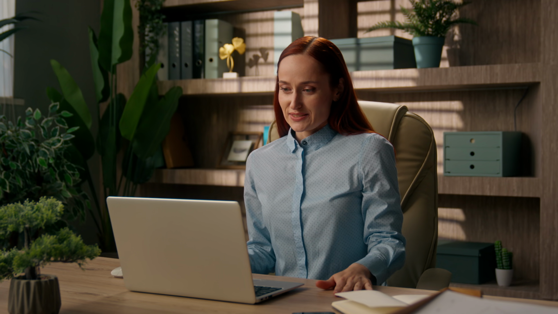 Businesswoman Caucasian Girl Employer Go Office Sit Table Open Desktop Computer Smiling Satisfied Business Woman Worker Manager StartÂ