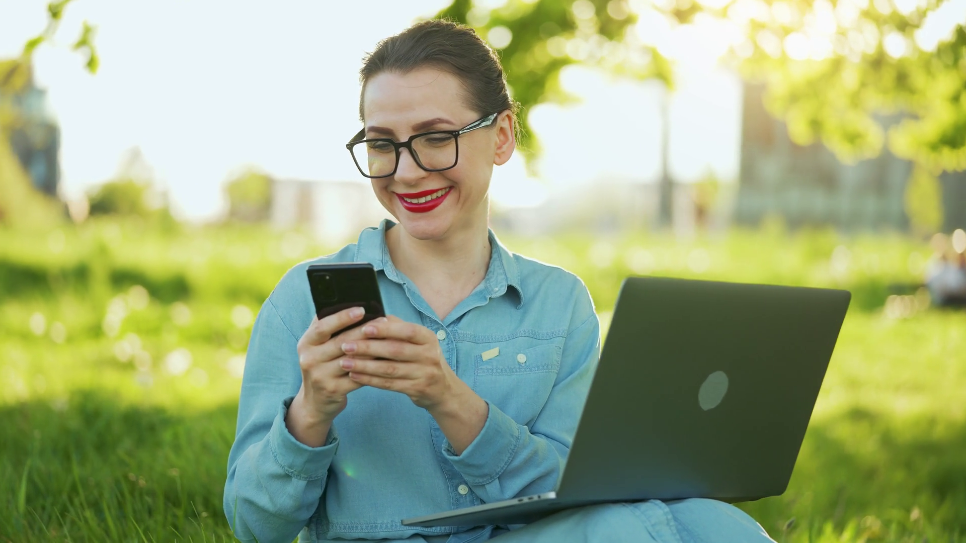 Busy Woman Working At The Laptop And Using Smartphone In The ParkÂ