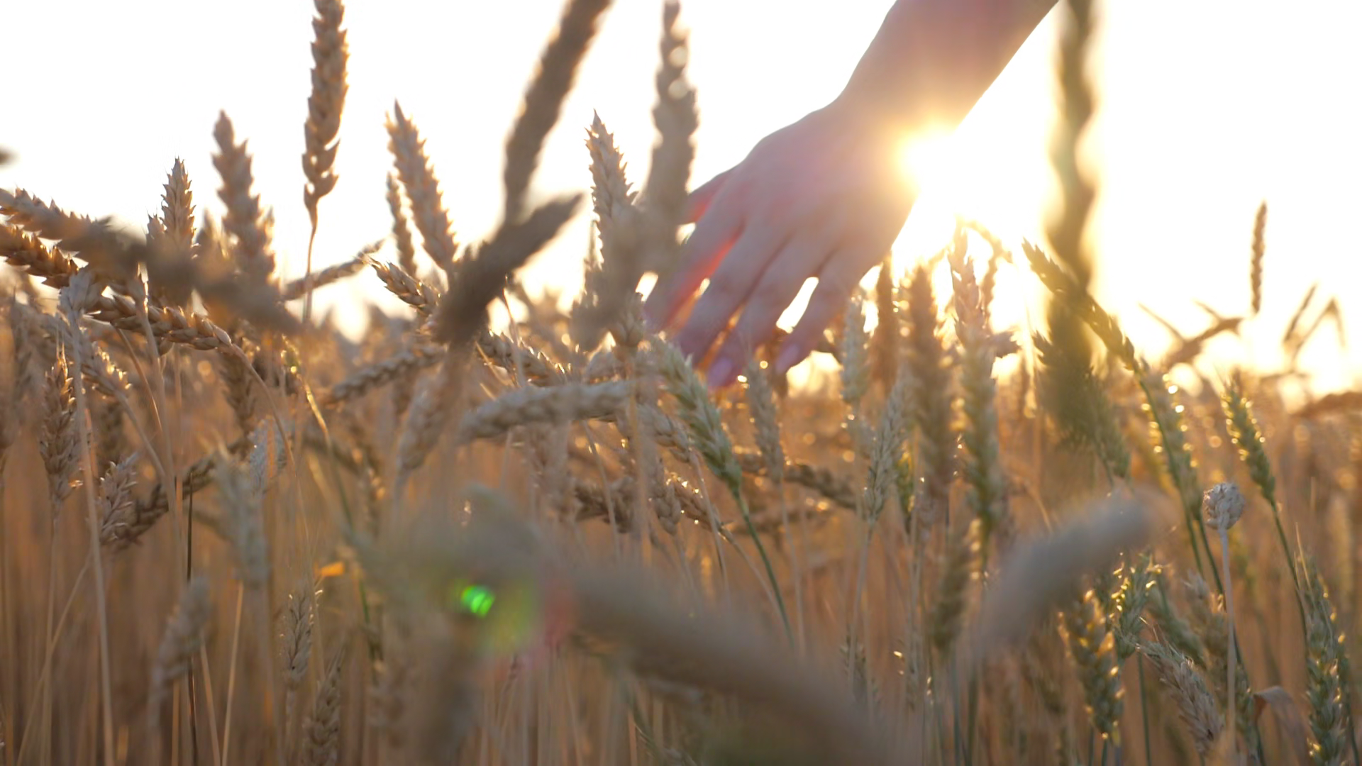 Camera Follow To Female Hand Tenderly Touching Crop Ears Close Up Of Girl Arm Stroking Golden Wheat Stems At Sunset Background Ripe Grain Plants Swaying Under Warm Sun Harvest Concept Slow MotionÂ