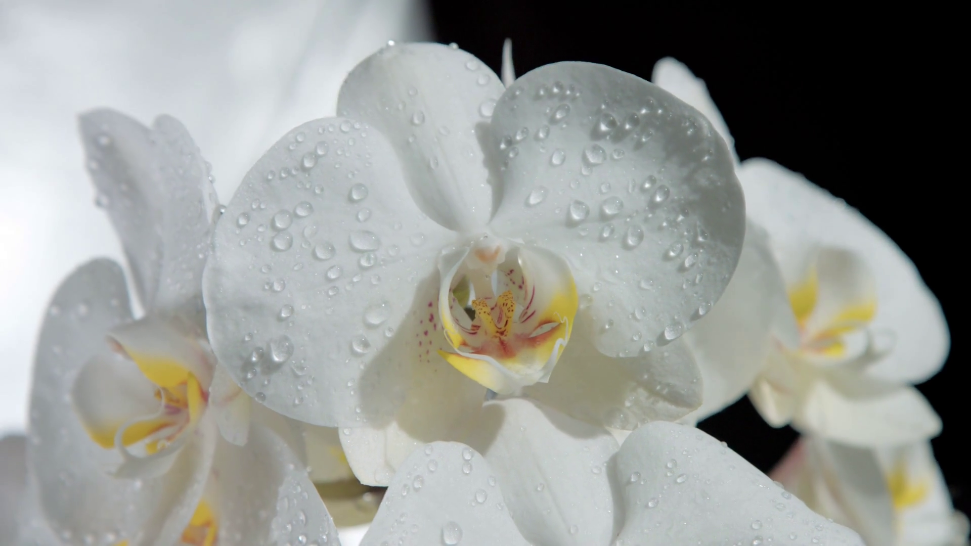 Camera Moves Around Of Blossom Orchids Covered By Water DropsÂ
