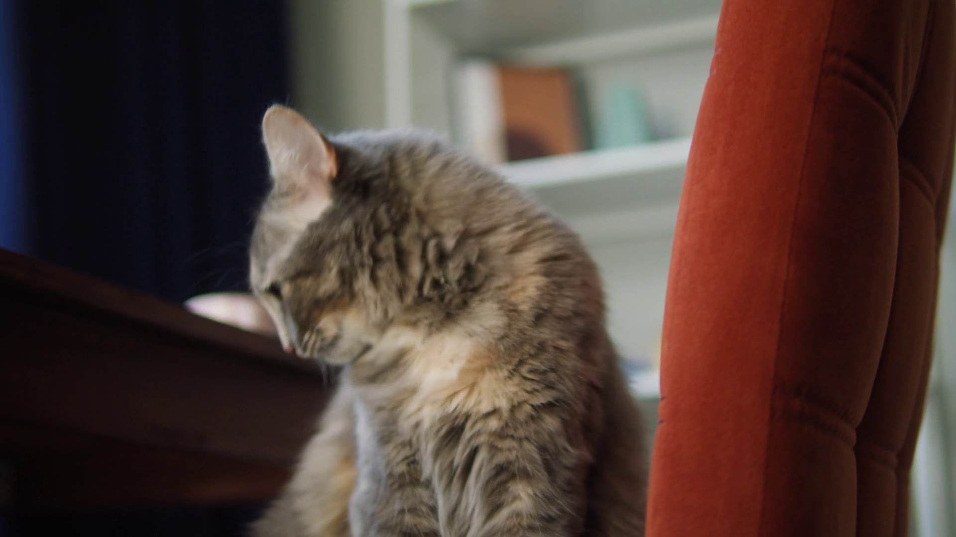 Cat Sitting On Chair In Living Room Domestic Animal At Home Kitten Near Table Closeup Grooming Paw Furry Pedigreed Pet Relaxing Little CompanionsÂ