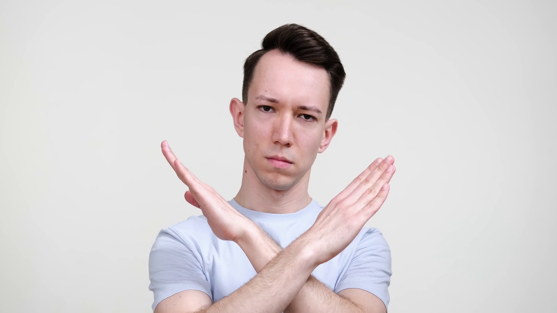 Caucasian Man Stop Sign With Crossed Arms On White BackgroundÂ