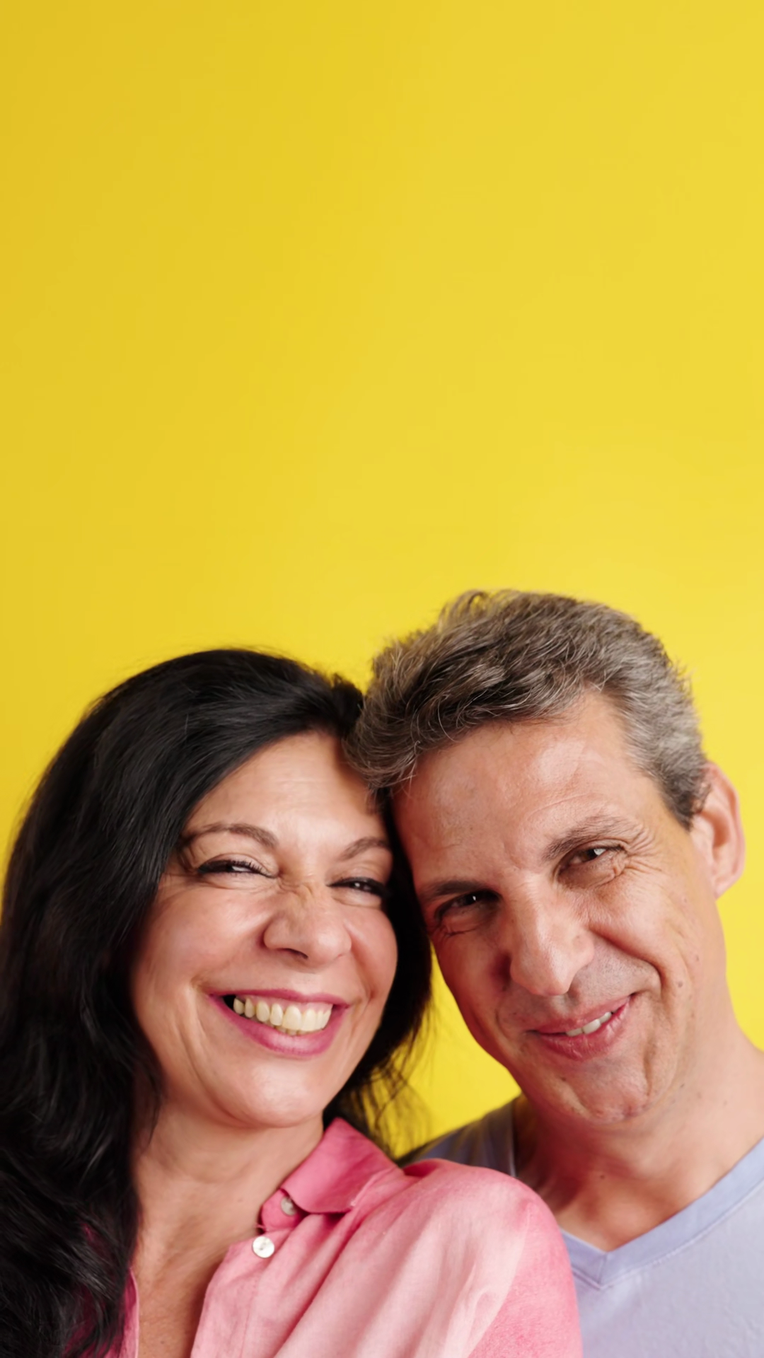 Cheerful And Mature Man And Woman Laughing And Having Fun Together Romantic Couple In Love Sharing A Happy Moment Against A YellowÂ