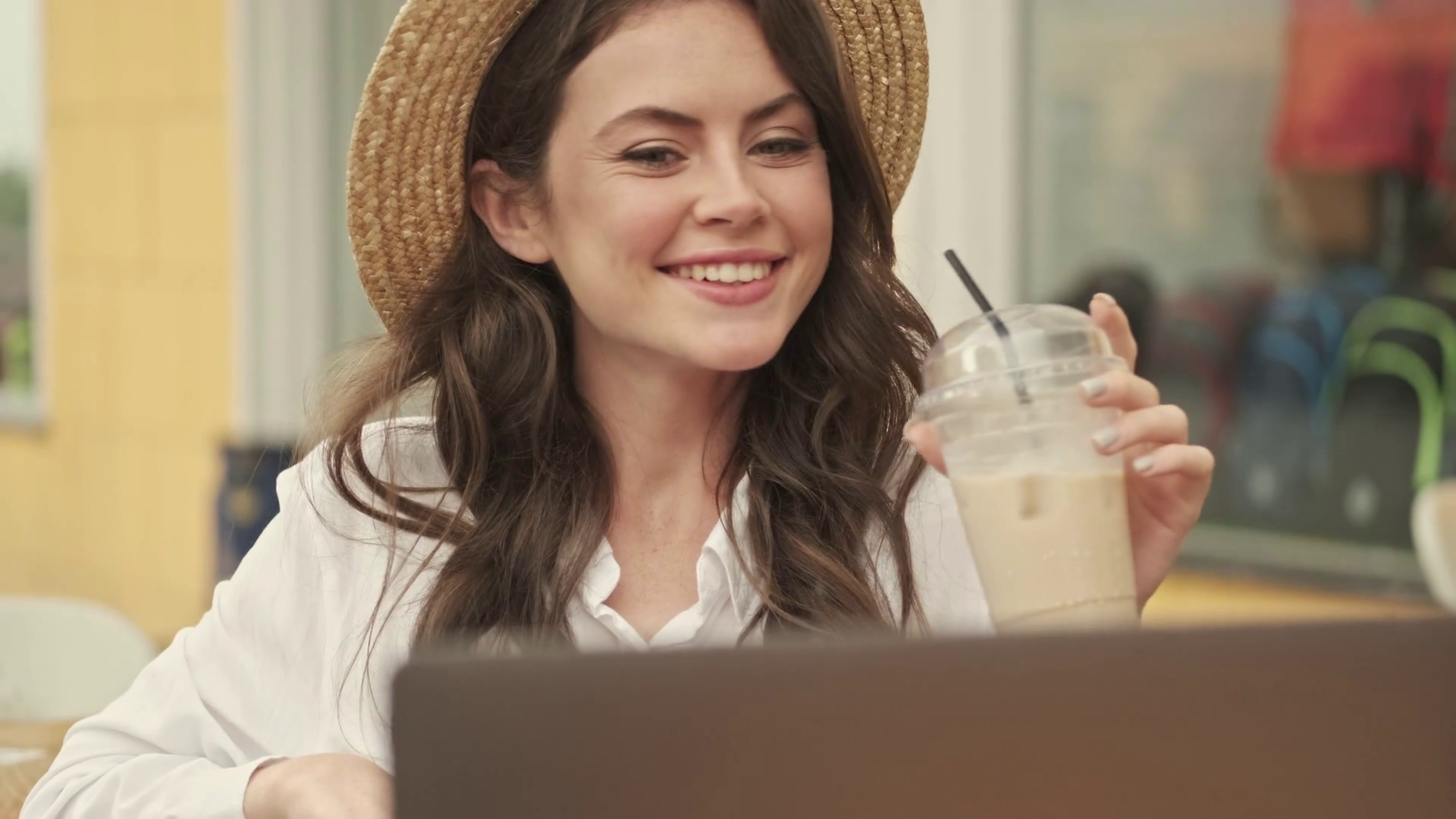 Cheerful Attractive Woman Wearing Hat Using Laptop Computer And Drinking Coffee While Sitting By The Table In Cozy Cafe OutdoorsÂ