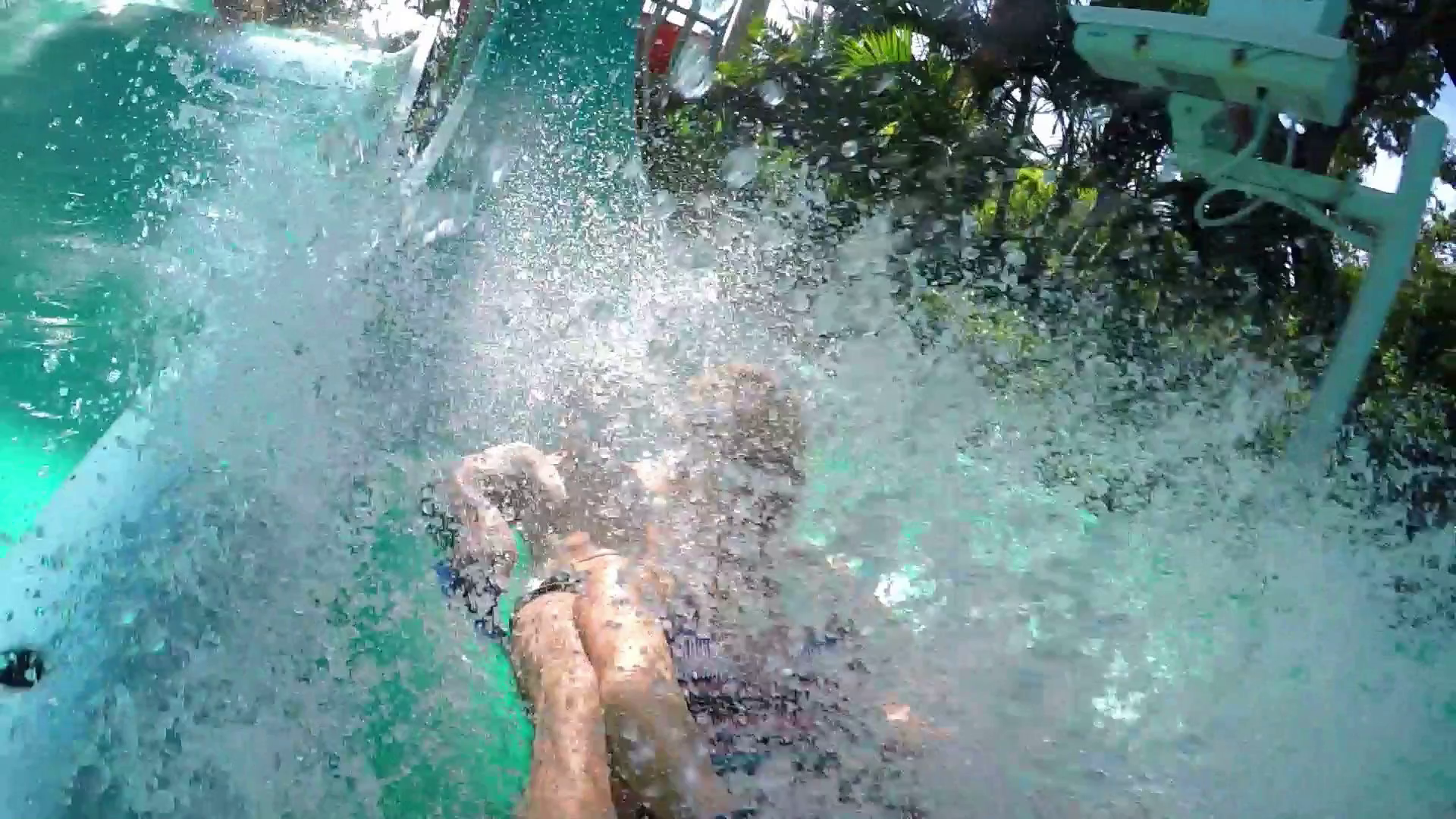Cheerful Couple Sliding In Waterpark With Gopro On Water Slide