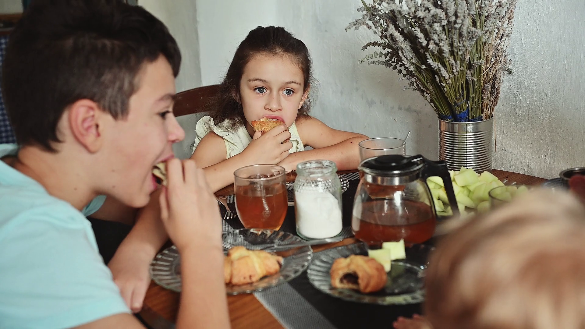 Children Enjoying Family Breakfast With Pastries And Fruit Kids Sitting Around A Table At Home Creating A Warm And Cozy Atmosphere Sibling Bonding Over Morning MealÂ