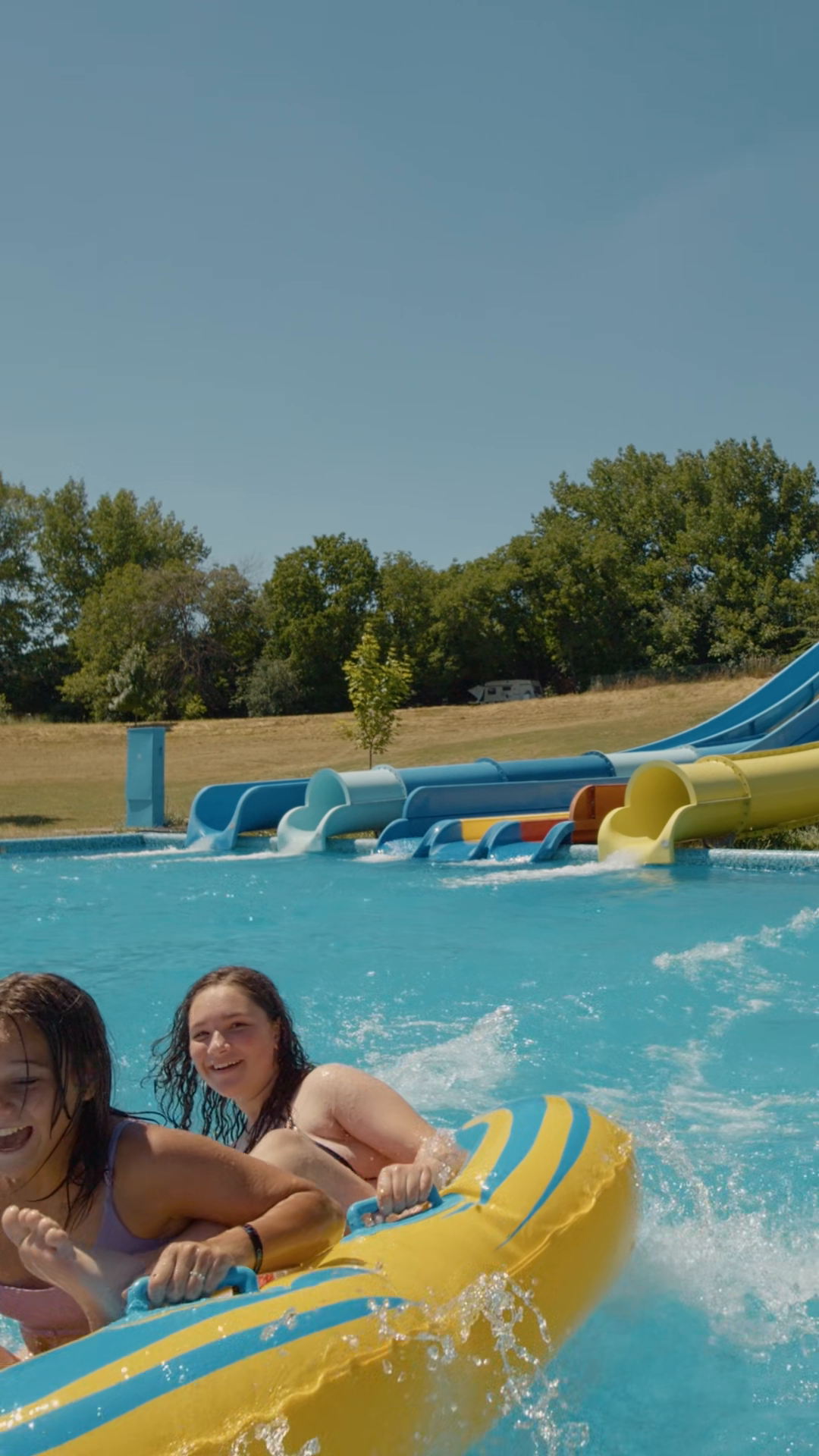 Chisinau Republic Of Moldova 20 August 2024 Vertical Screen Girls Riding Down An Orange Slide In A Water Park Water Slide Aqua Park With Pool Playground For Children On Summer HolidayÂ