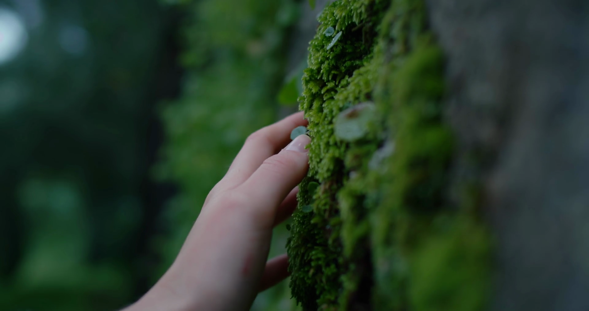 Cinematic Close Up Of Female Fingers Touch Gently Moss On Tree Bark Tender And Connection To Nature And Environment Conscious Traveling And Protection Of Rain ForestÂ