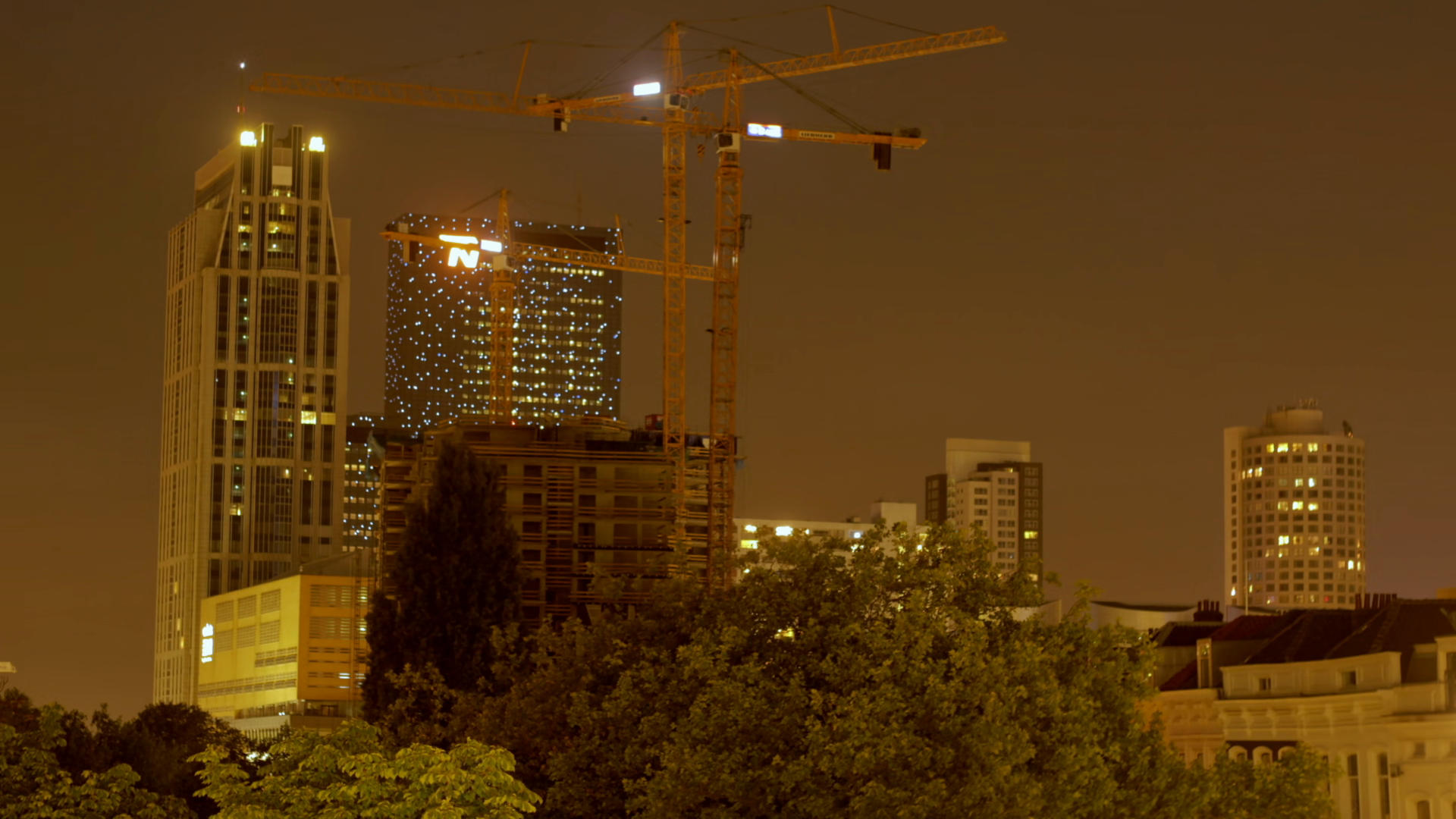 City Skyline At Night Featuring Illuminated Buildings And Construction CranesÂ