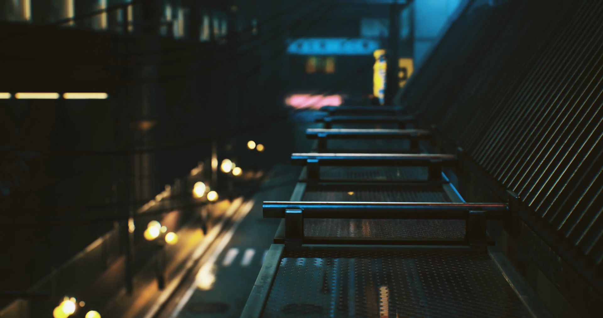 Cityscape At Night Showcasing Urban Lights And Shadows Along A Walkway